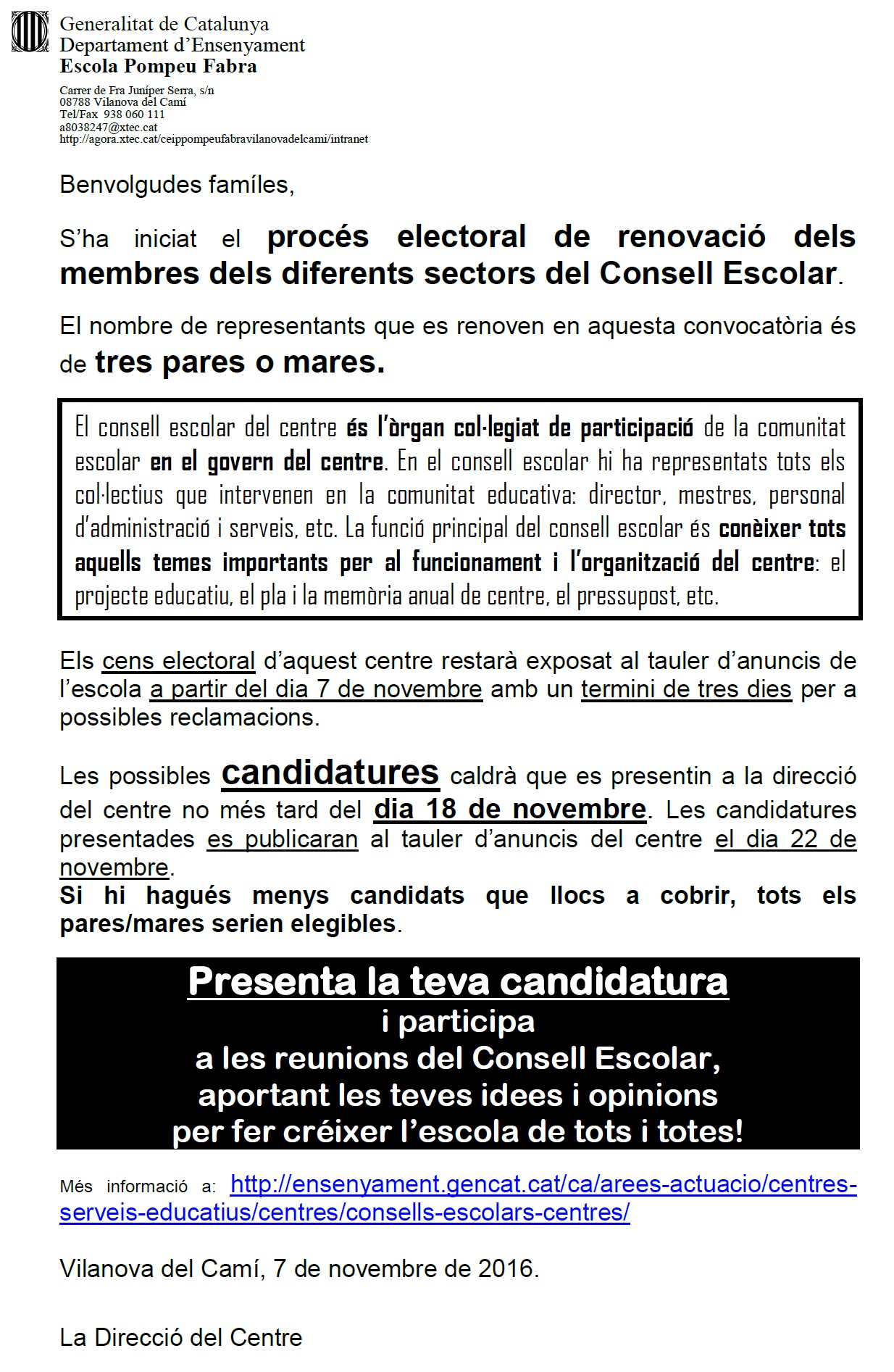 ELECCIONS AL CONSELL ESCOLAR Feu un comentari / Per admin / 7 de novembre de 2016 / General Infantil Portada Primària CALENDARI ELECCIONS ESCOLA