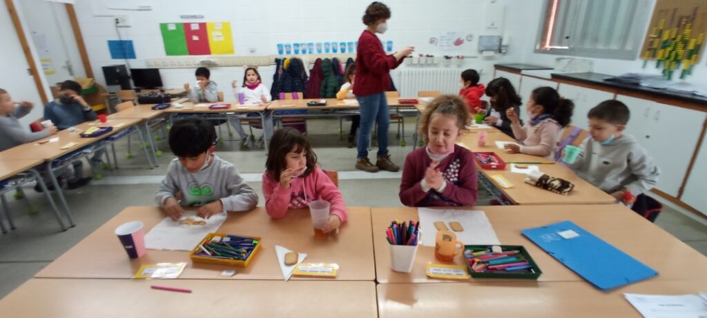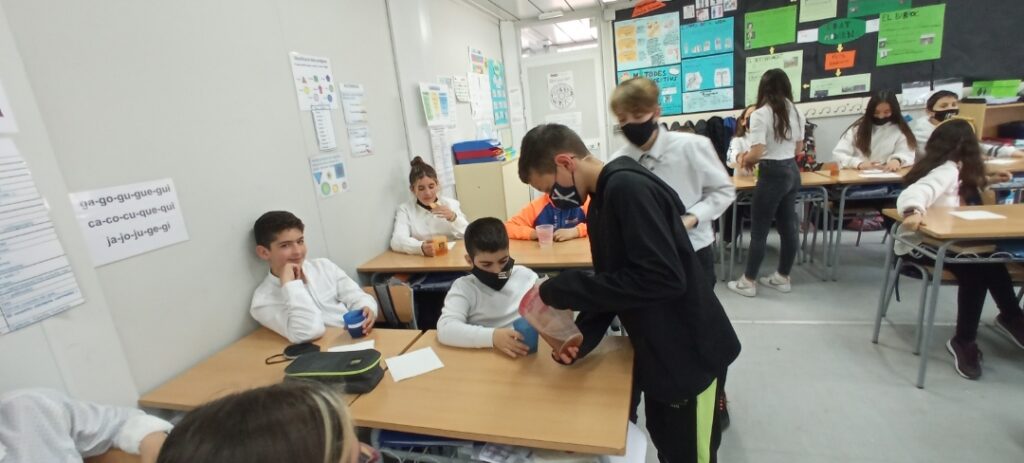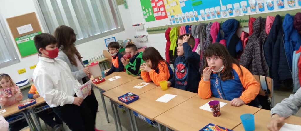A causa de la pluja vam haver d’adaptar l’activitat i fer-ho a les aules, ja que el pati estava moll. Vam iniciar la festa amb una videotrucada on dos nens de la classe de 6è van dir unes paraules de benvinguda a la resta de classes de l’escola. Tot seguit, per parelles, vam anar a la classe que la mestra d’anglès ens havia assignat per servir el te i donar galetes tot parlant anglès i interpretant el paper de cambrers i cambreres.
