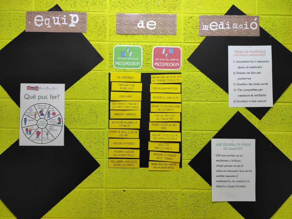 Aquest curs hem engegat aquesta nova proposta on, a cada grup-classe de 1r a 6è, hi ha escollit/da un mediador/a. El grup de mediadors/es formem l’Equip de mediació de l’escola que, amb l’ajuda de l’Equip Directiu, organitzem trobades per millorar en el paper de mediador de classe i aprendre a resoldre els petits conflictes que puguin sorgir entre l’alumnat.