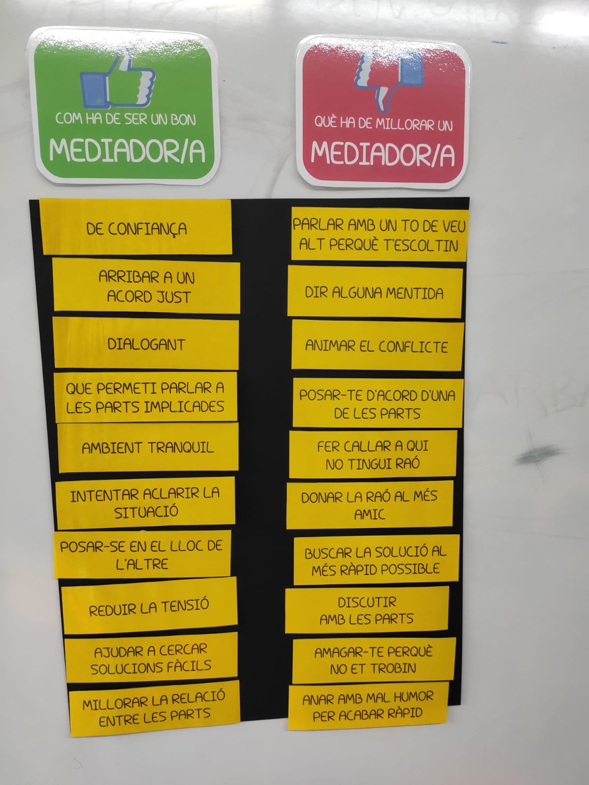 Aquesta ha estat la 1a trobada per inaugurar aquest nou equip. A través d’un mural amb targetes, hem après què vol dir ser un bon mediador/a (dialogant, escoltar a les parts implicades, arribar a un acord…) i què és allò que no hauríem de fer. A més, hem conegut els passos a seguir quan sorgeixi un problema entre companys/es de classe i també quins són els aspectes més importants a tenir en compte a la mediació. També disposem d’una roda de la resolució de conflictes, amb totes les opcions que tenim quan ens trobem amb un problema. Tota aquesta informació, la tenim en cartells que penjarem a cada classe i, a més, tenim un mural al passadís de l’escola per a tenir-ho present.