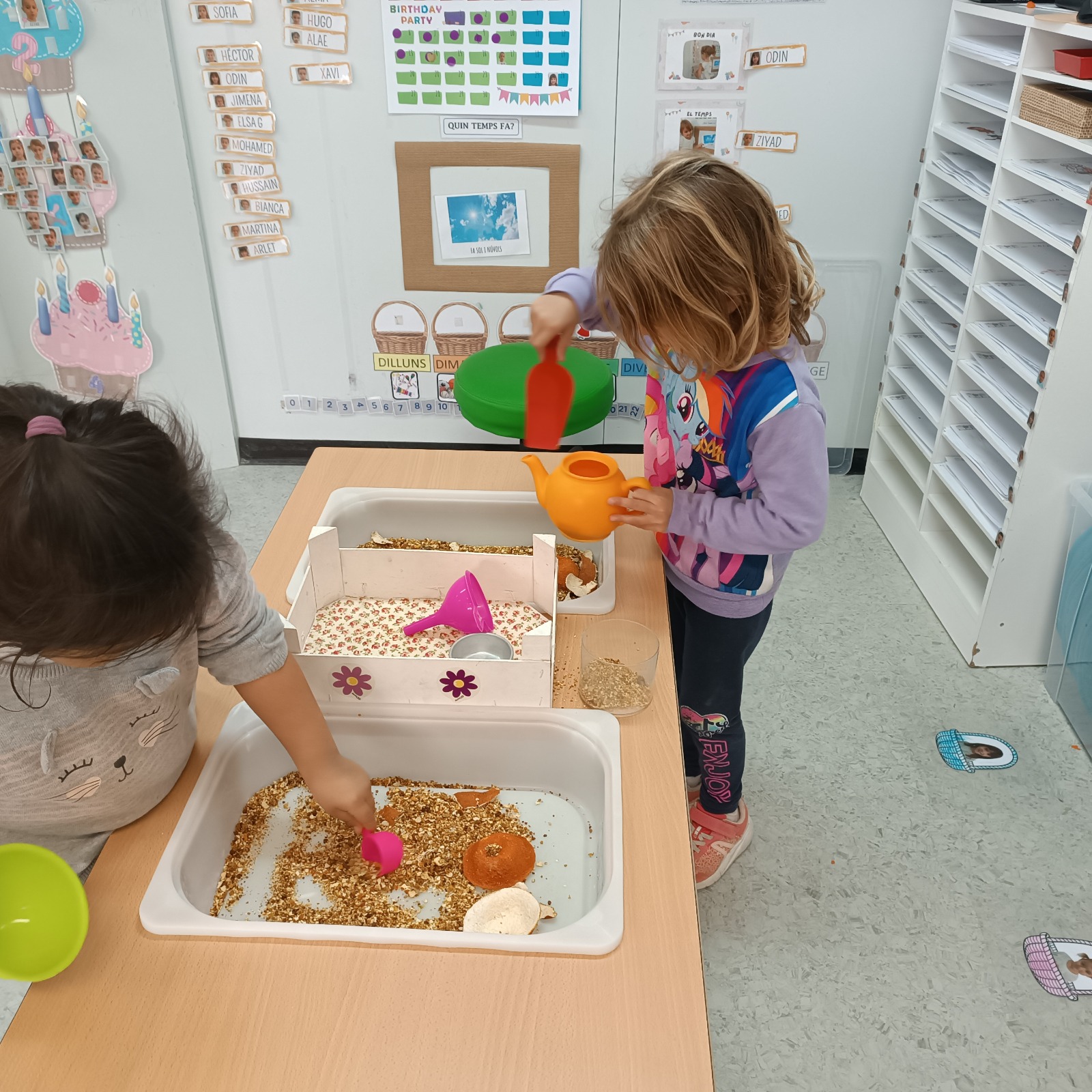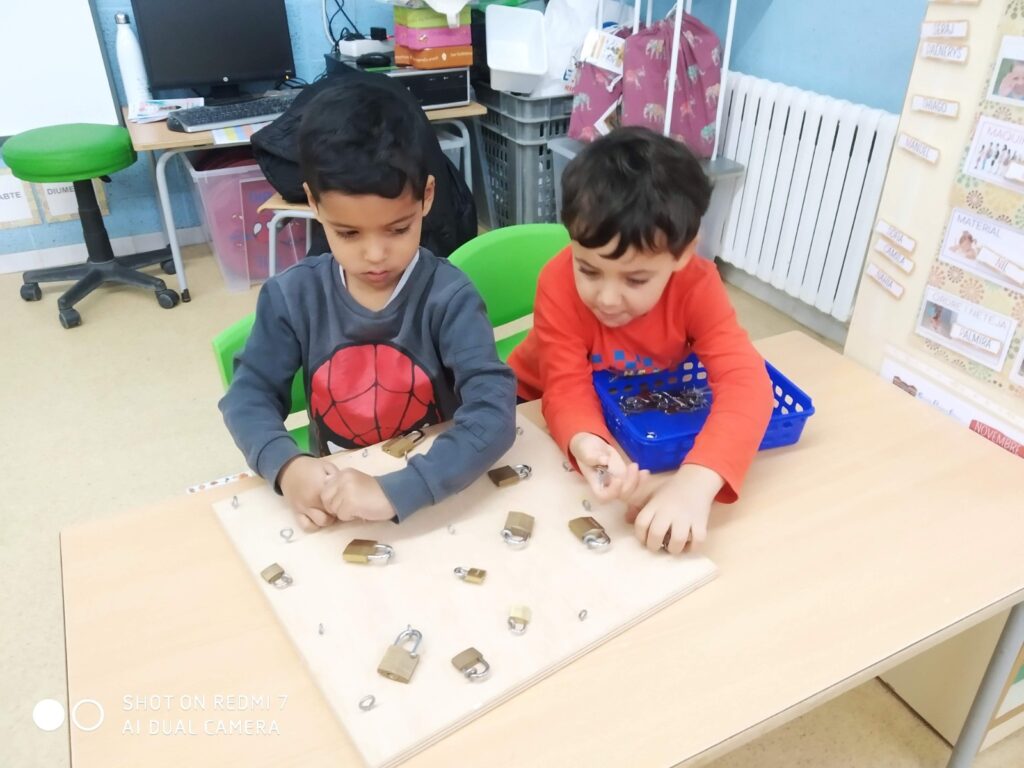 Al matí dels dimecres cada infant escull un objecte que representa un dels 9 espais: el pinzell per l’Art, la mascara pel Teatre, l’espelma per la Llum, la peça del lego per la Construcció, la petxina per la Natura, el macarró per l’Experimentació, la mà per la Manipulació, l’escuma per la Psicomotricitat i la lupa per les Ciències.