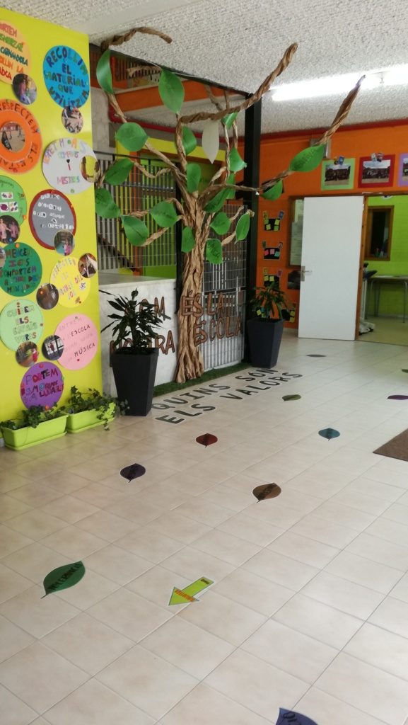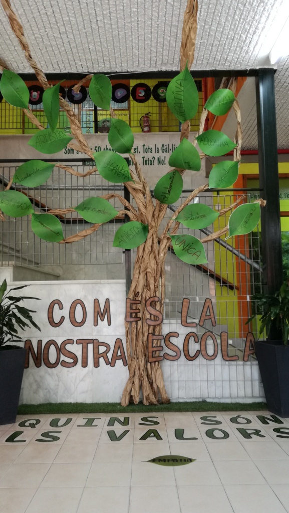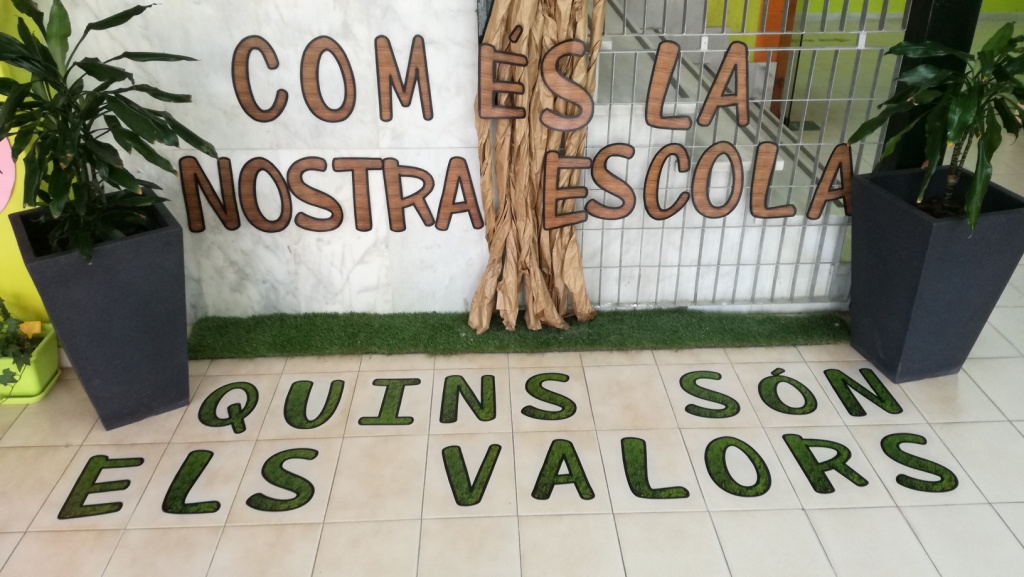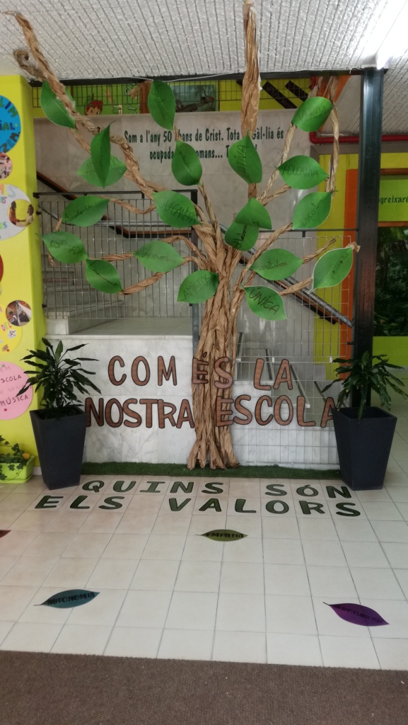 En motiu de les Portes Obertes a l’Escola, l’arbre que presideix el vestíbul del centre aquest curs, s’ha convertit en un arbre ple de fulles amb el títol “Com és la nostra escola?” i l’acompanya també un cartell que simulant gespa amb la frase “Quins són els valors?”.