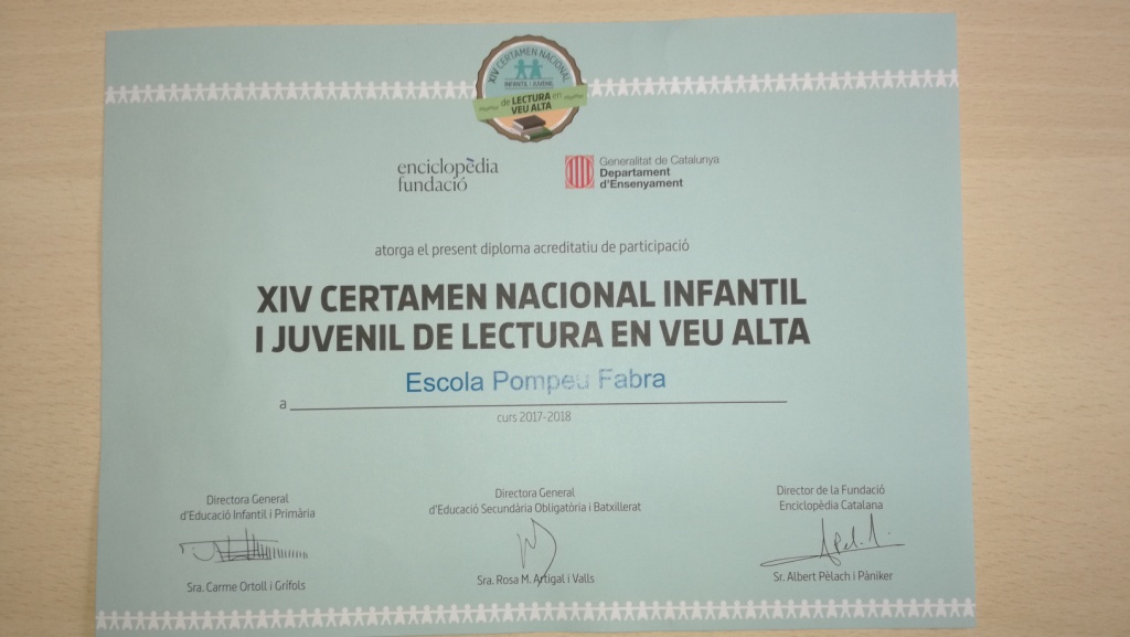 L’Escola Pompeu Fabra ha participat amb el Pau, a la categoria de cicle Superior, i amb la Lamiss, a la categoria de cicle mitjà. Tots dos, han compartit l’experiència amb alumnat d’escoles de la comarca als Quarts de final. Cada alumne ha hagut de llegir un fragment del text seleccionat de tot el recull d’escrits que prèviament s’havia preparat. L’acte ha estat amenitzat també per actuacions de l’alumnat d’un institut d’Igualada i hem rebut un diploma per haver participat a l’acte.