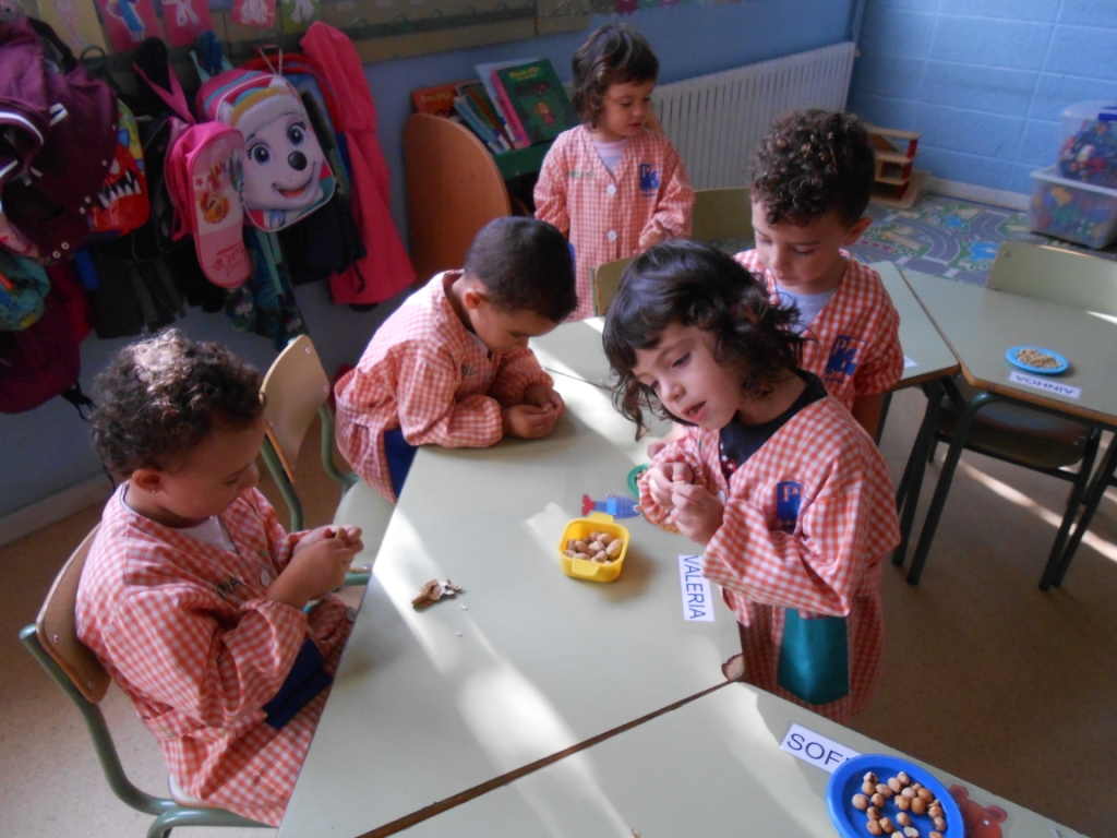 Les classes de la Rínxols d’or i l’Aneguet lleig estem treballant la Tardor. Aquests dies hem pogut manipular i conèixer alguns fruits secs típics d’aquesta estació: nous, ametlles, pinyons, avellanes…