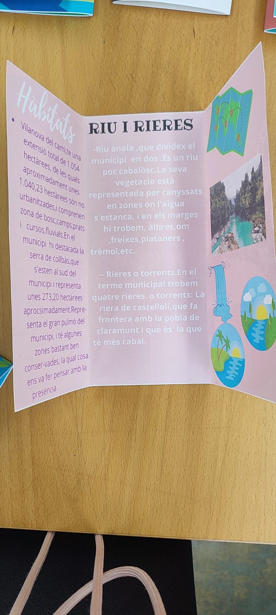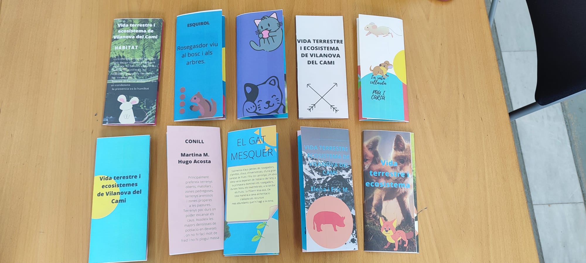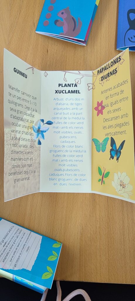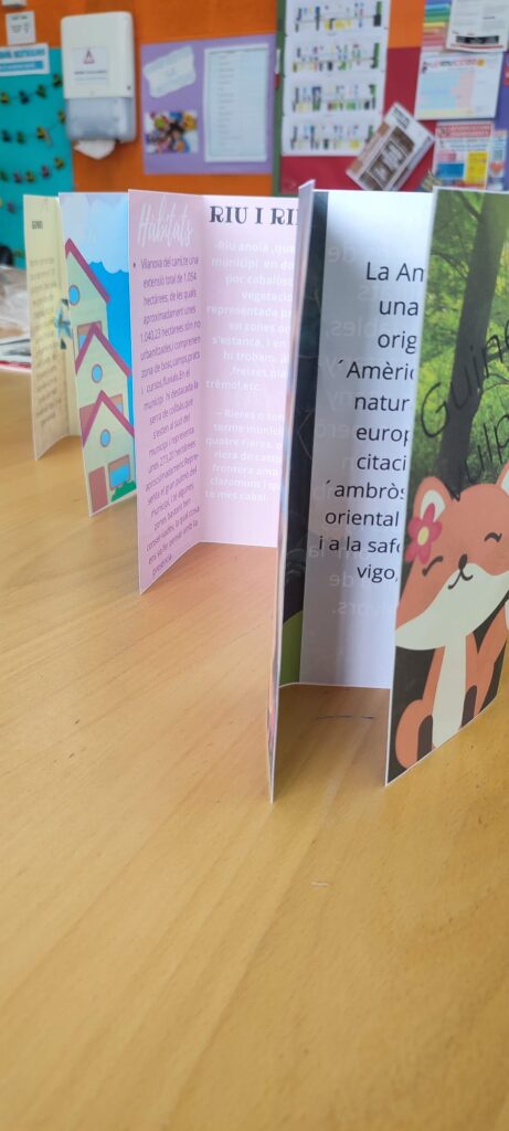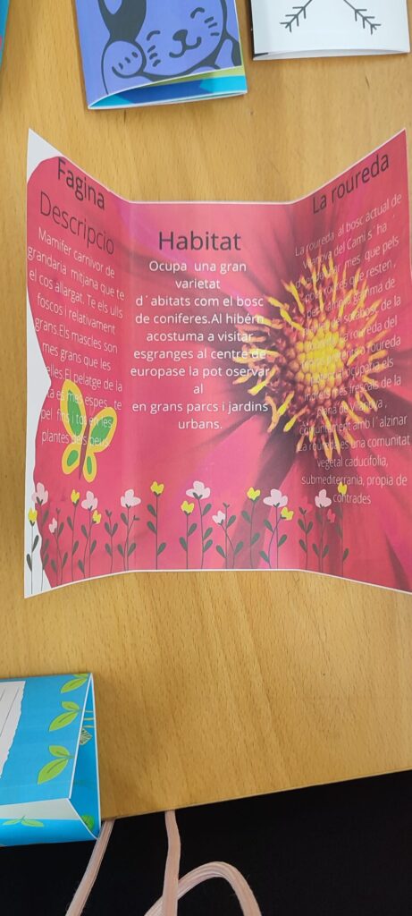 Per tal de treballar aquest tema, els nens i nenes han estat organitzats per parelles i han fet una recerca sobre el tema fent ús de llibres informatius que alguns alumnes han portat de casa seva i altres dels quals disposem a l’escola. Aquesta recerca ha estat encarada a la realització d’un producte final innovador i molt creatiu: un tríptic fet amb el programa de Canva. Cada parella ha pogut triar l’animal i/o planta propis de l’ecosistema de Vilanova del Camí, fer-ne una recerca i plasmar la informació més rellevant en el seu tríptic.