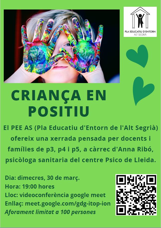Continuant amb les xerrades dins del marc del PEE Alt Segrià, el 30 de març i el 4 d’abril van tenir lloc les darreres, per tal de completar tots els cicles. En concret, el 30 de març “Criança en positiu” va estar adreçada a Ed Infantil, i el 4 d’abril, “Com afrontar l’adolescència ” es va centrar més en 4t, 5è i 6è d’Ed Primària.