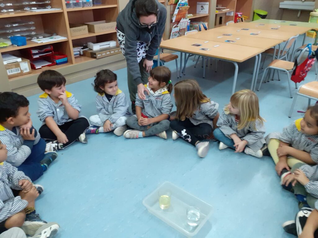 Vam aprendre que l’oli pesa menys i per això “es queda surant a dalt”.