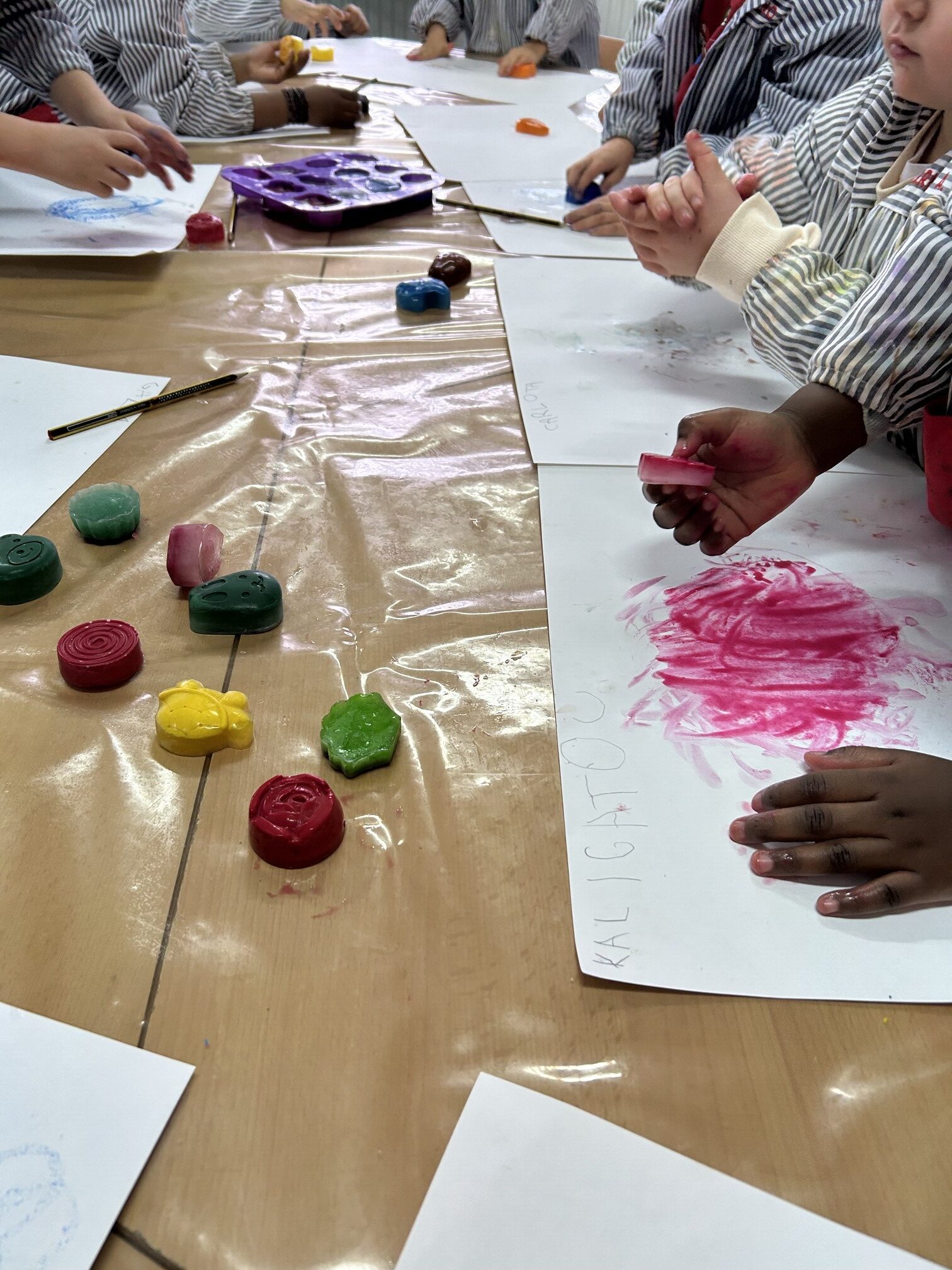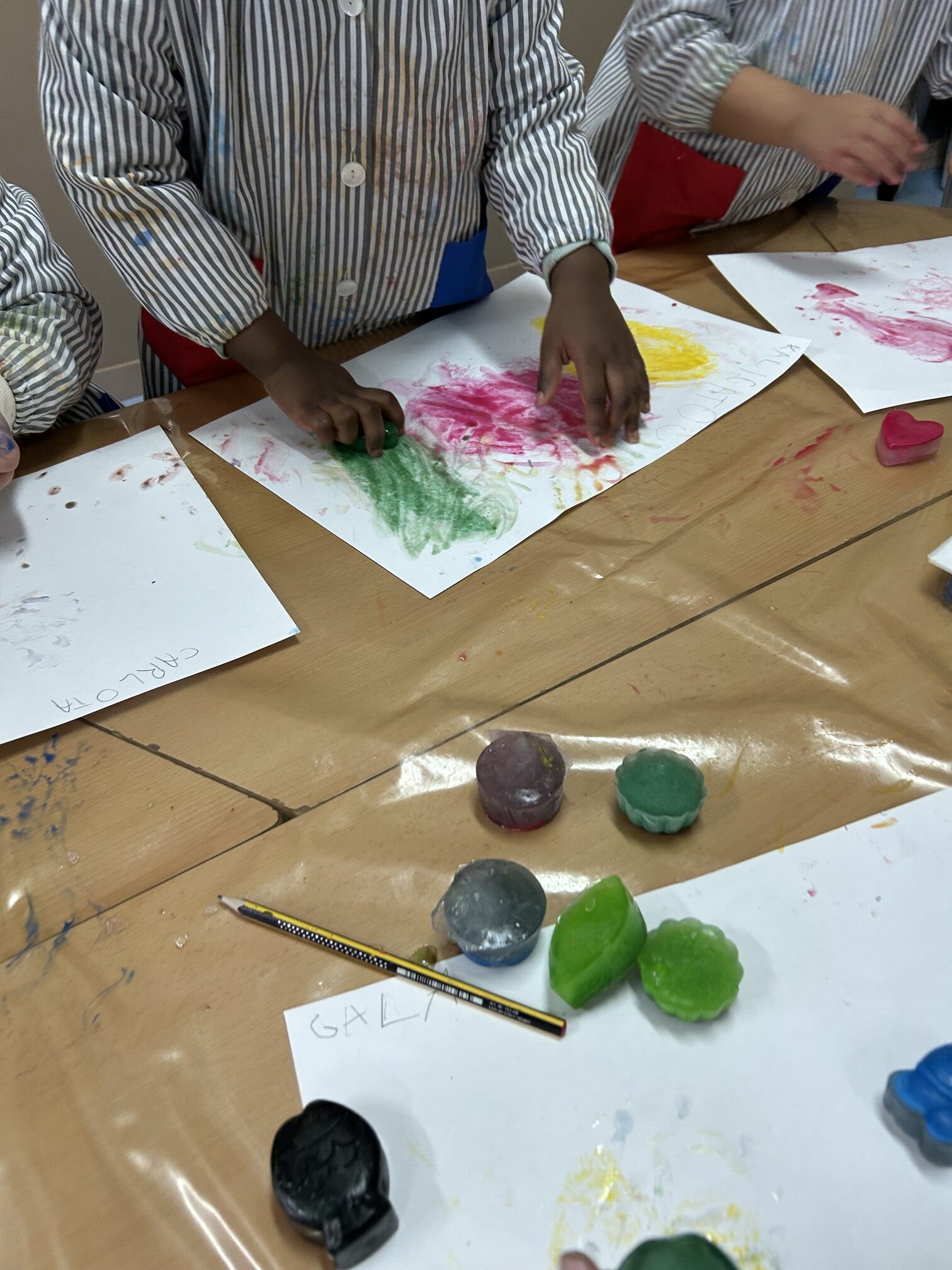 Ara estem investigant els diferents canvis i transformacions que pateix l’aigua mitjançant experiments. Hem pogut observar com canvia l’aigua; primer de color, amb la tempera i després com es transformava a l’estat sòlid. Amb els glaçons hem creat diferents obres d’art.