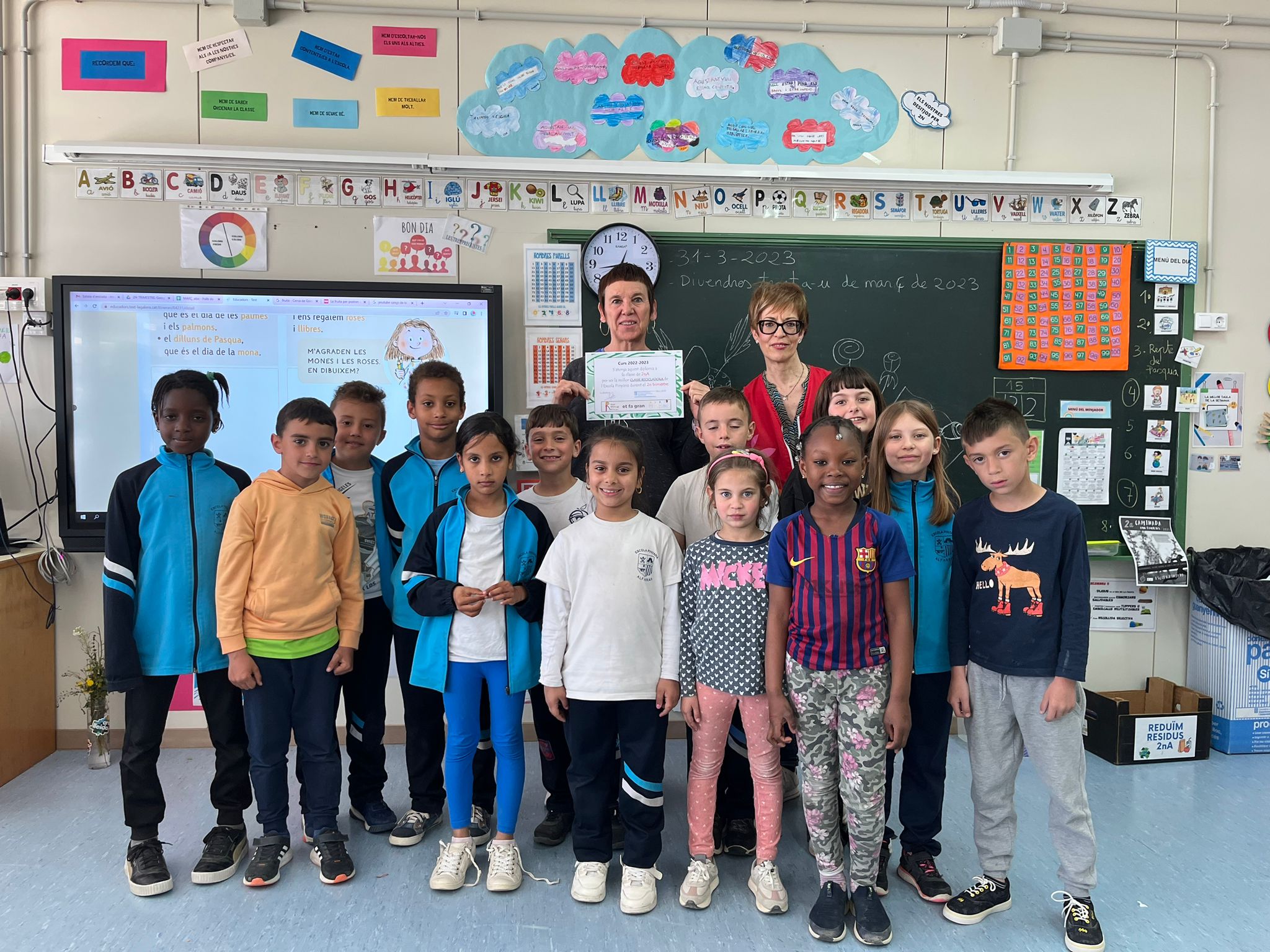 Després de fer el recompte, corresponent al segon trimestre, de la classe que més bé ha reciclat hi ha hagut un empat entre l’alumnat de 1rB i 2nA! Quant a la classe que millor ha col·laborat en la reducció d’embolcalls ha estat l’alumnat de 2nA! Així que els hi hem fet entrega d’un diploma per a l’aula.
