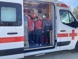 Aquesta setmana han vingut a l’escola el pare de la Mariona i la mare de la Blanca de 1r que són voluntaris de la Creu Roja. Ens han fet un taller de primers auxilis. Hem après el que cal dir quan es truca a emergències, com és una ambulància per dins, què hi ha en una farmaciola i com hem d’actuar en cas d’ennuegament. Ens ha agradat molt. Moltes gràcies!