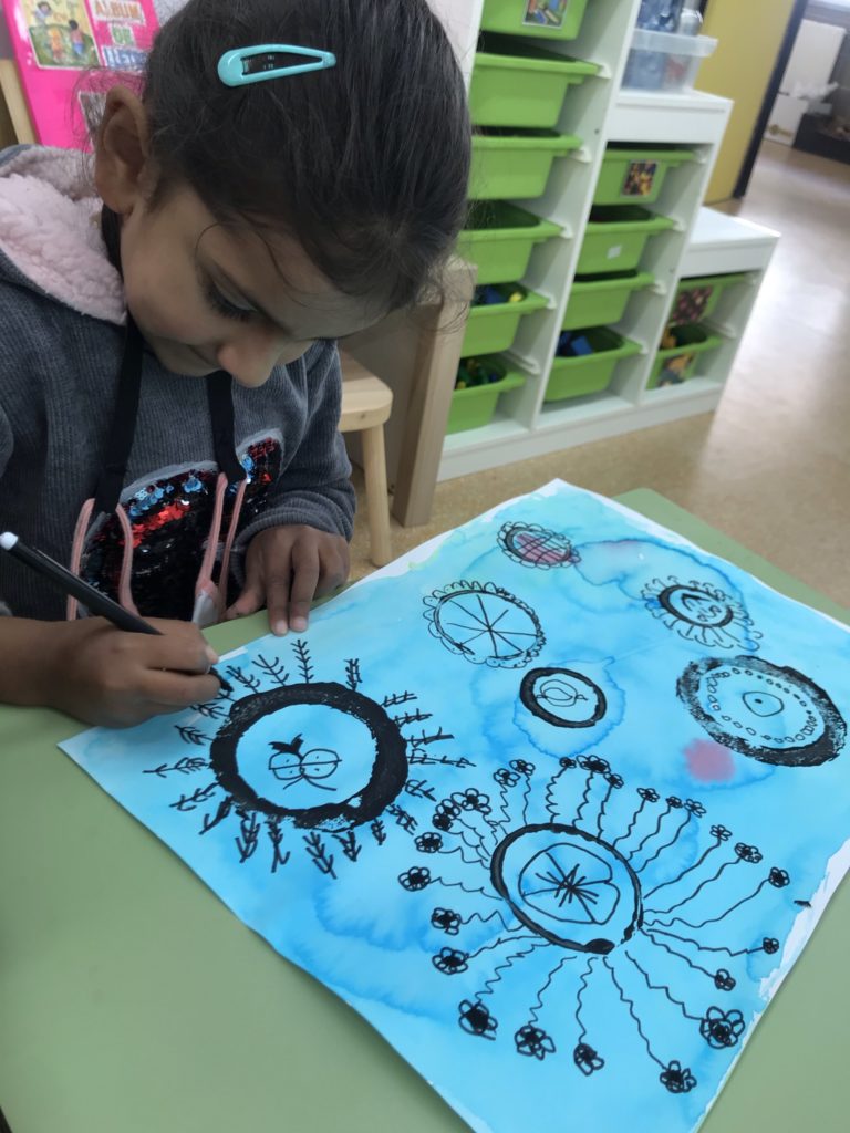 Us ensenyem el treball d’artistes que hem fet les nenes i nens de P4/5. L’hem anomenat ELS CORONAVIRUS. En una primera fase hem tenyit el fons amb paper pinotxo i ens hem adonar que no ens fa falta pintura i pinzell per pintar, podem fer-ho de mil maneres! Després hem estampat cercles de diferents mides