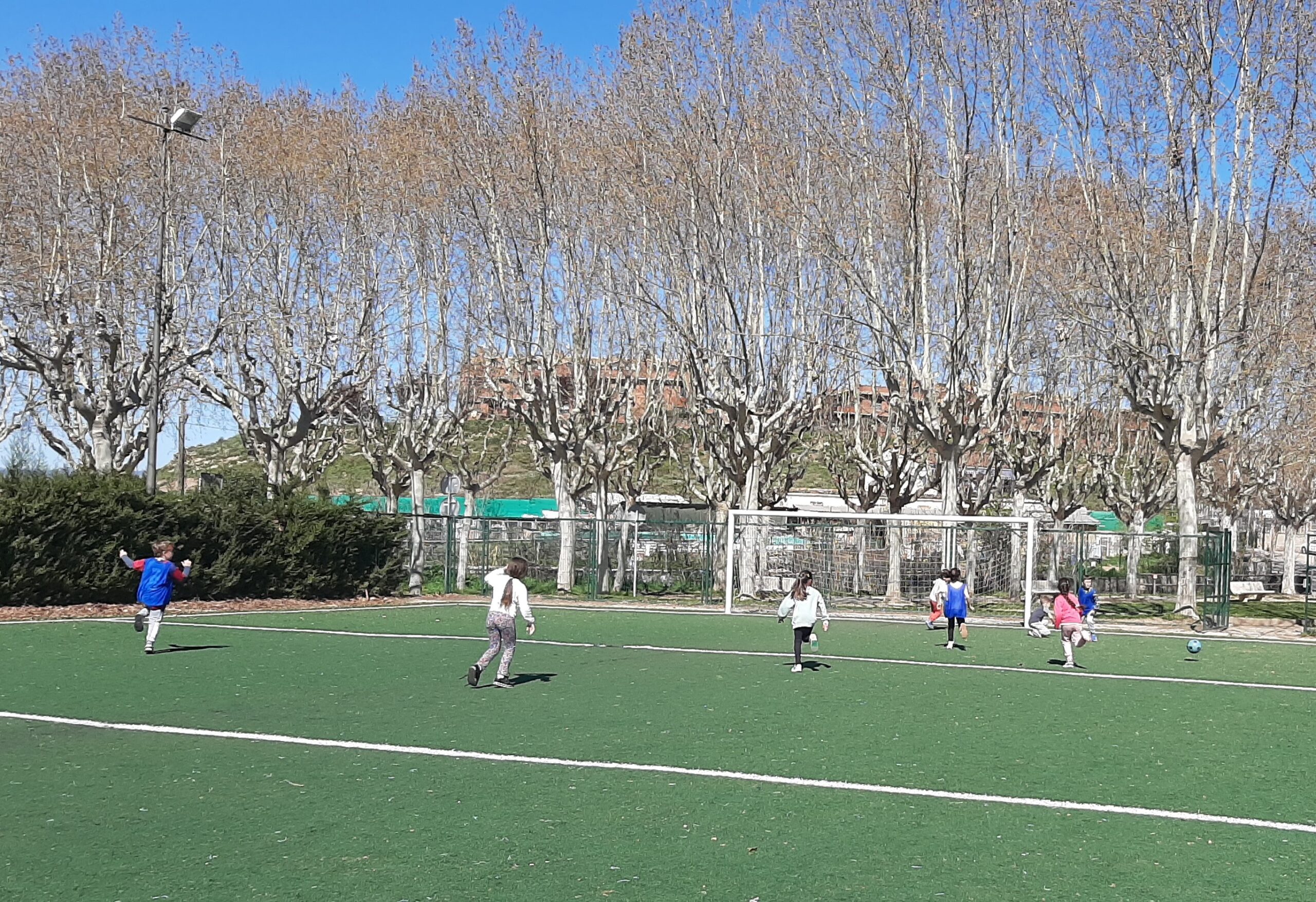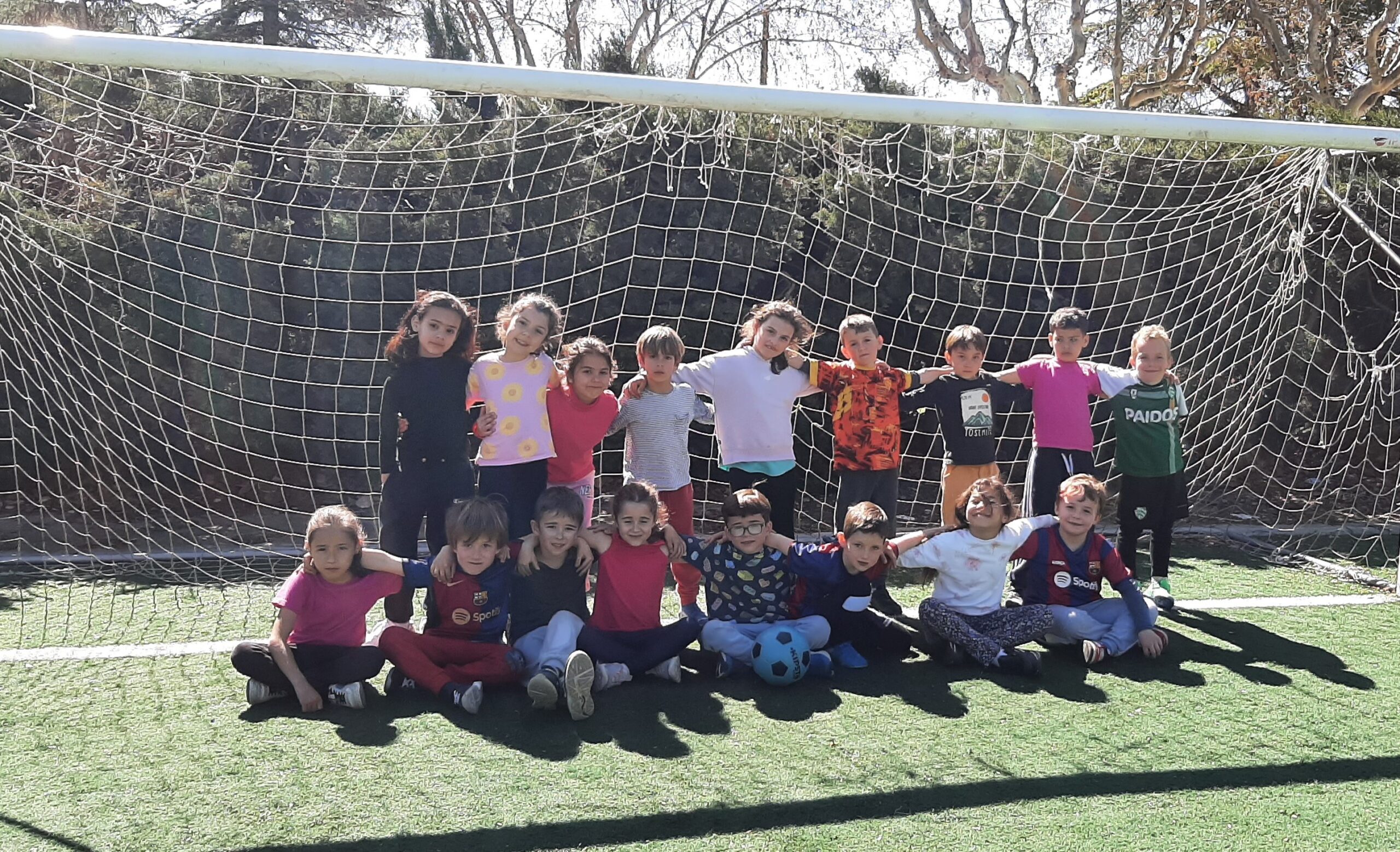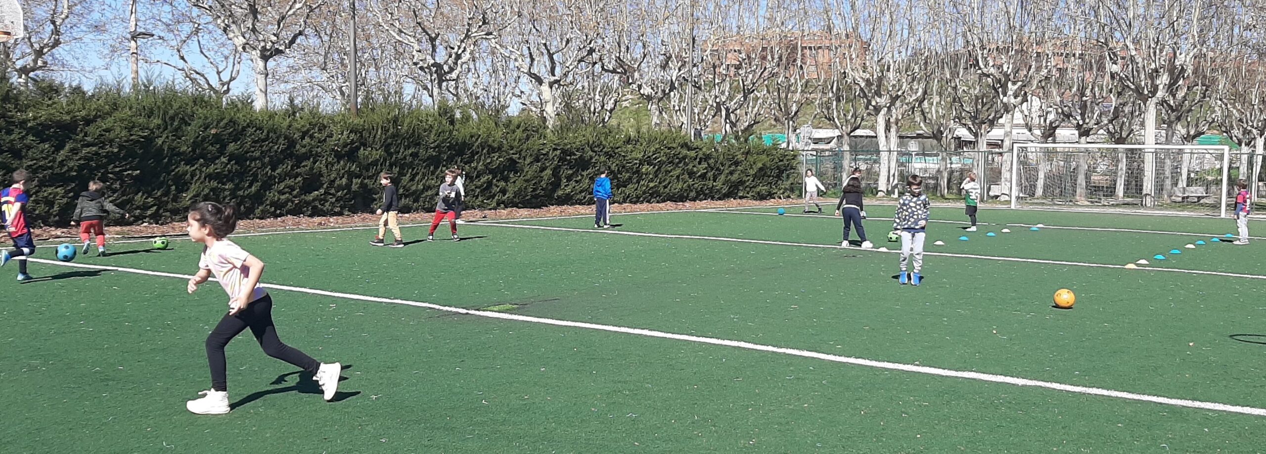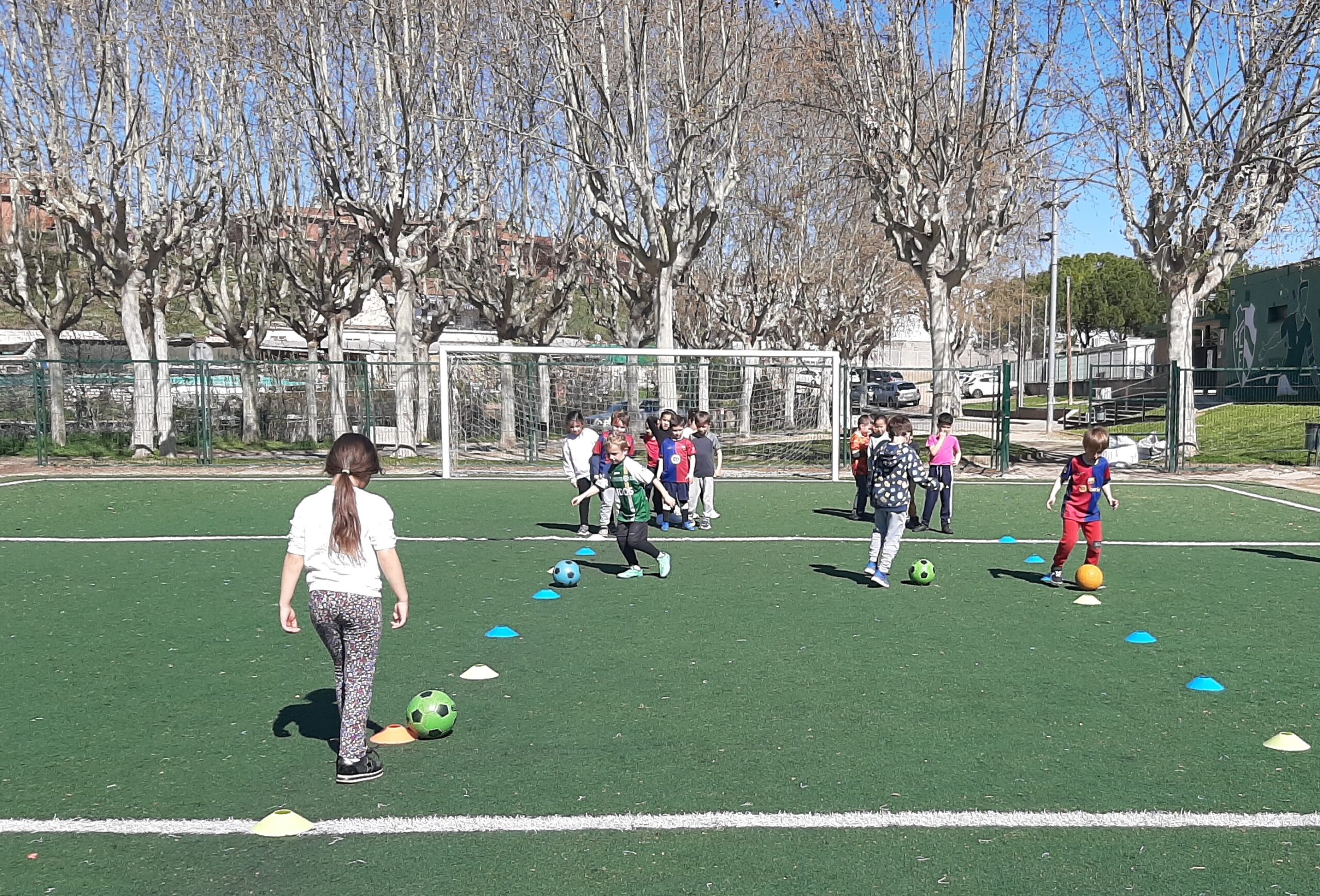 Avui dilluns, la colla de primer hem fet l’última sessió per aprendre a jugar una mica més bé a futbol al camp annexe del Futbol Club Fruitosenc. A mig matí, hem agafat el sarronet d’educació física i tot el material (pitralls, pilotes i cons) i tot petant la xerrada, hem fet camí fins el camp de futbol. A l’arribar, hem esmorzat i hem tingut una mica de temps lliure per jugar. Tot seguit, hem començat la classe en un entorn privilegiat: camp de gespa artificial i porteries reglamentàries.