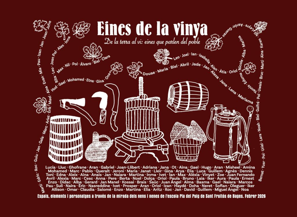 Aquest any, l’alumnat ha escollit com a eix de treball “Les eines de la vinya. De la terra al vi, eines que parlen del poble”, una proposta estretament vinculada tant amb el projecte de curs com amb l’entorn i el passat vitivinícola del municipi. Al llarg del procés de creació, els alumnes han investigat el vincle de Sant Fruitós amb la vinya, han observat l’entorn proper i les restes de vinya situades als voltants de l’escola, i han conegut les eines que tradicionalment s’utilitzaven per treballar la terra i elaborar vi, gràcies també a la visita al museu municipal La Memòria de la Vinya i el Vi.