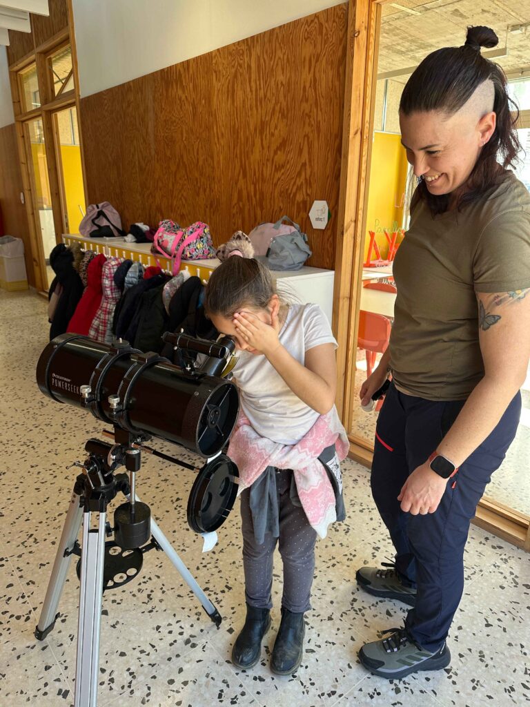 L’Anabel ens va explicar que el seu telescopi és reflector, és a dir, un tipus de telescopi que utilitza miralls per recollir i enfocar la llum. També vam poder observar les diferents parts de l’instrument i ens van explicar què s’ha de fer per poder mirar les estrelles o la Lluna. Tant els alumnes com les mestres vam poder fer moltes preguntes i tot seguit, vam viure el moment més emocionant, quan l’Anabel va calibrar el telescopi i vam poder observar un punt concret i molt llunyà des de l’interior de l’escola.