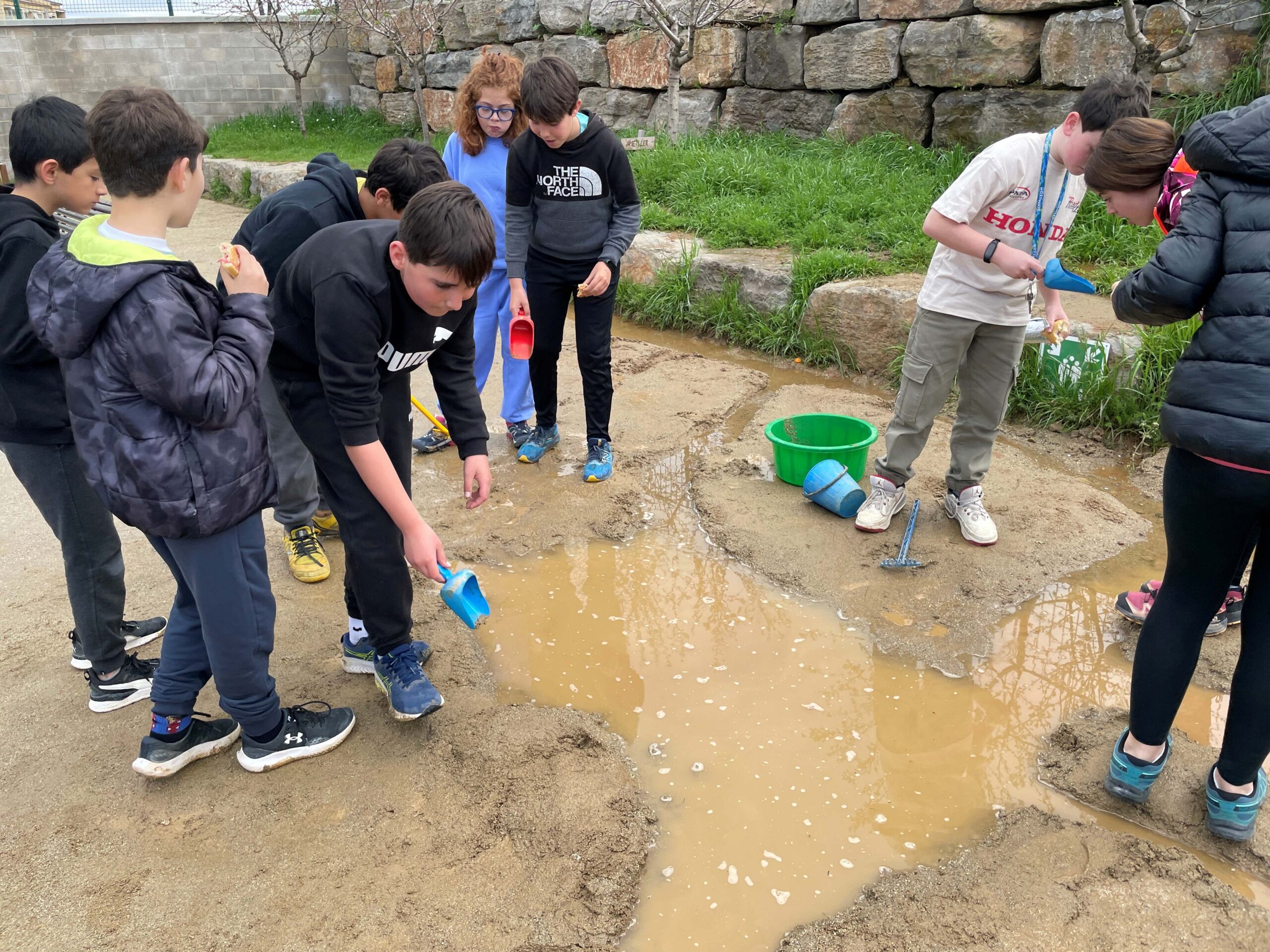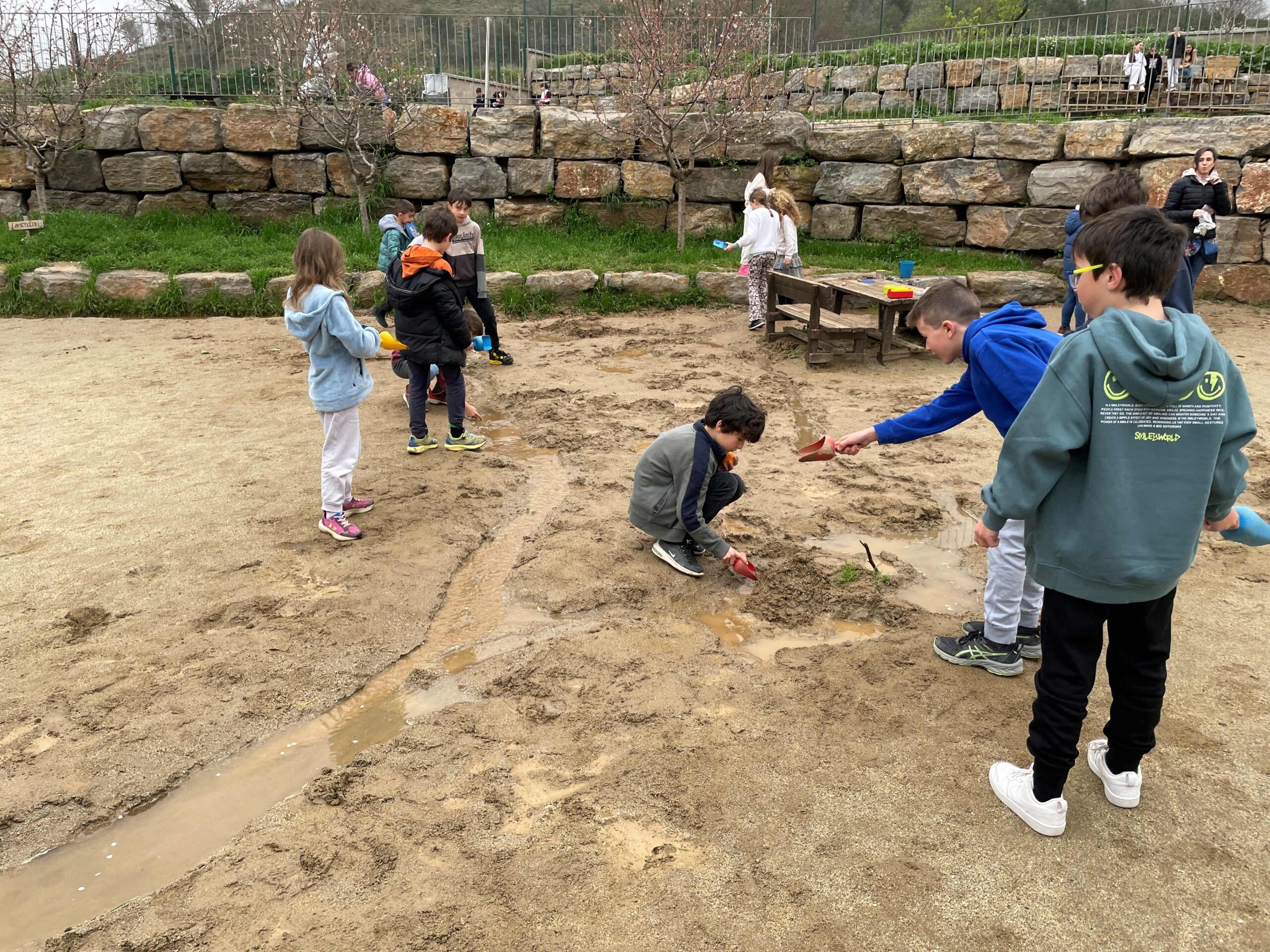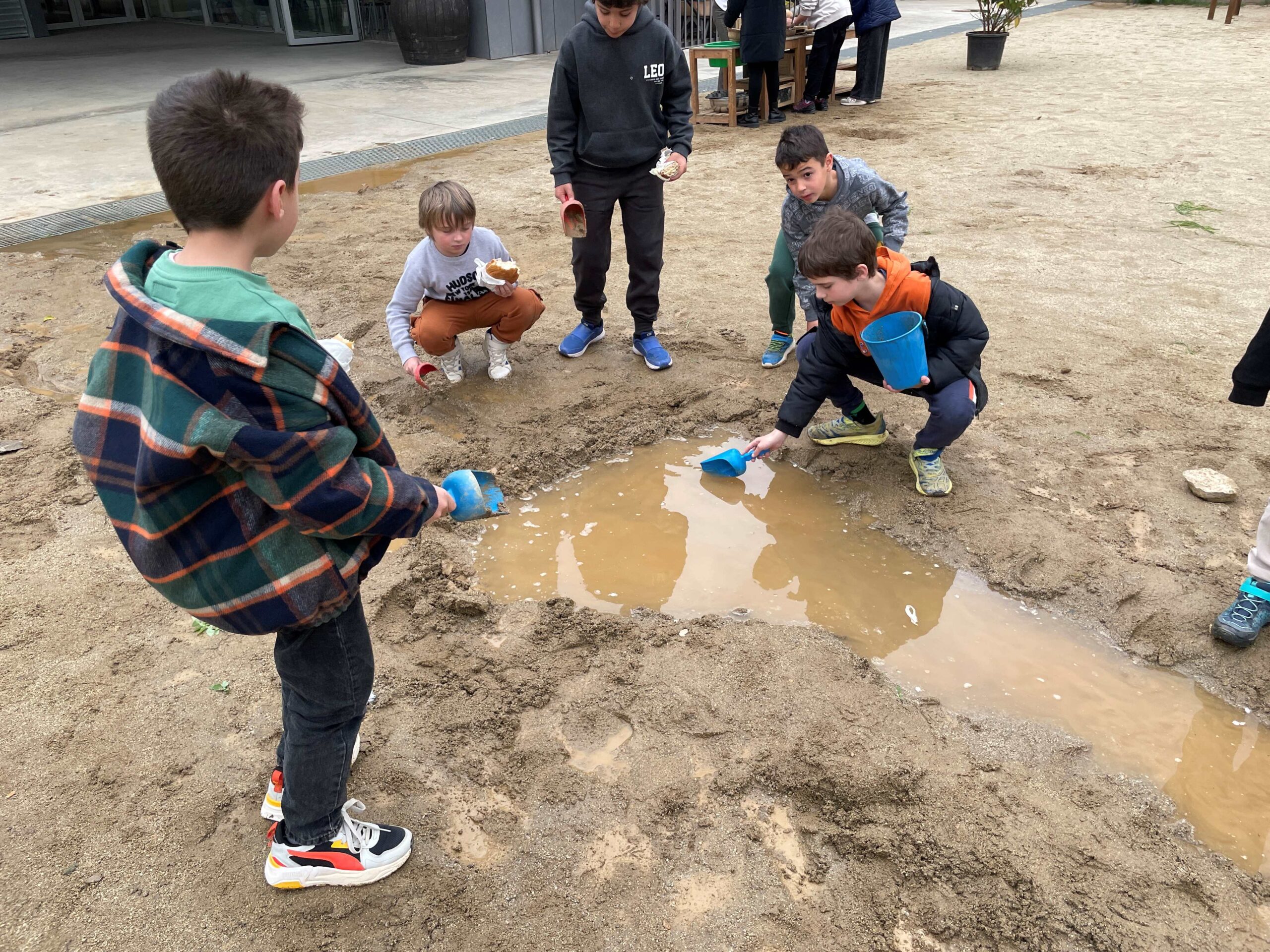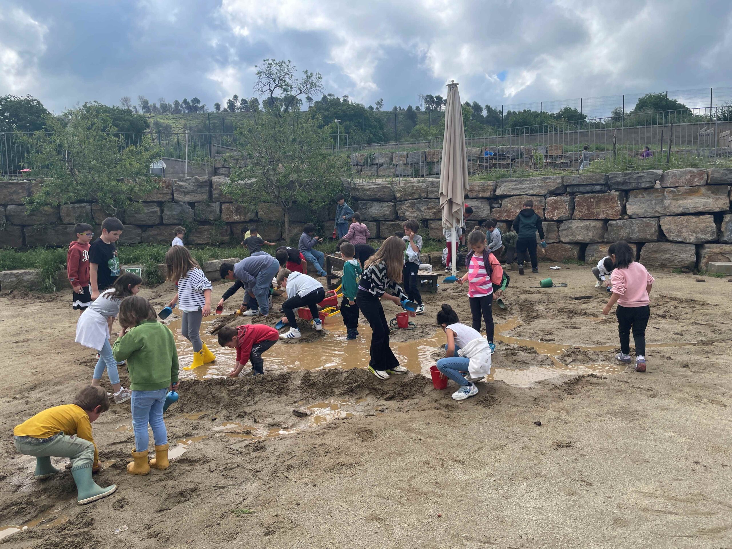 Amb pales i galledes a les mans, es converteixen en petits enginyers i exploradors. Amb gran entusiasme, construeixen preses, illes, pantans, séquies i rierols. Segueixen amb atenció el moviment de l’aigua, observant com es filtra per la terra, com en canviava el curs segons les seves intervencions i com cada gota planteja un nou repte. A través d’aquesta activitat, experimenten, cooperen i aprenen a interpretar el comportament de l’aigua amb creativitat i enginy. El pati, en els dies de pluja, es converteix en una veritable aula viva, on el joc simbòlic i l’aprenentatge espontani van de bracet.