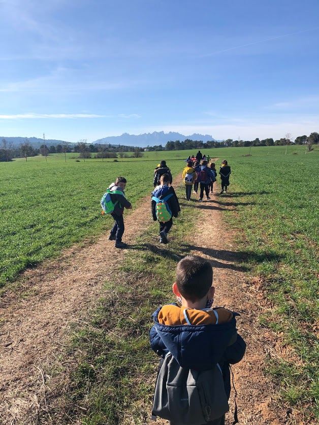 Els de P5 fent una ruta també pel Monpeità, per un camí secret fins a trobar aquestes vistes de les Brucardes i de Montserrat i amb els sembrats d’aquest verd intens en un dia radiant.