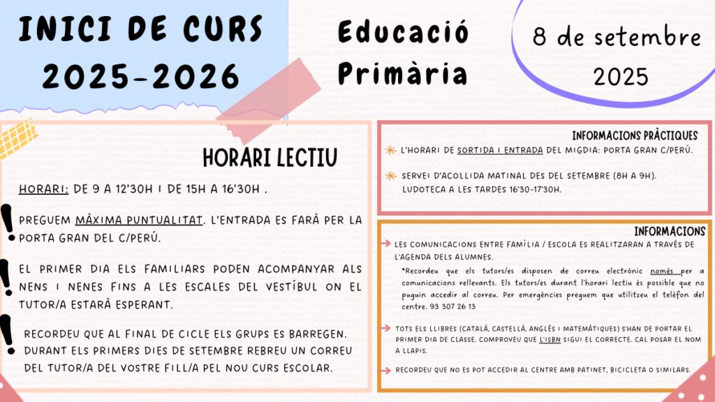 Instruccions d’inici de curs 2025-26 Feu un comentari / Per Escola Poblenou / 2 de setembre de 2025 / Educació Infantil Educació Primària General Portada