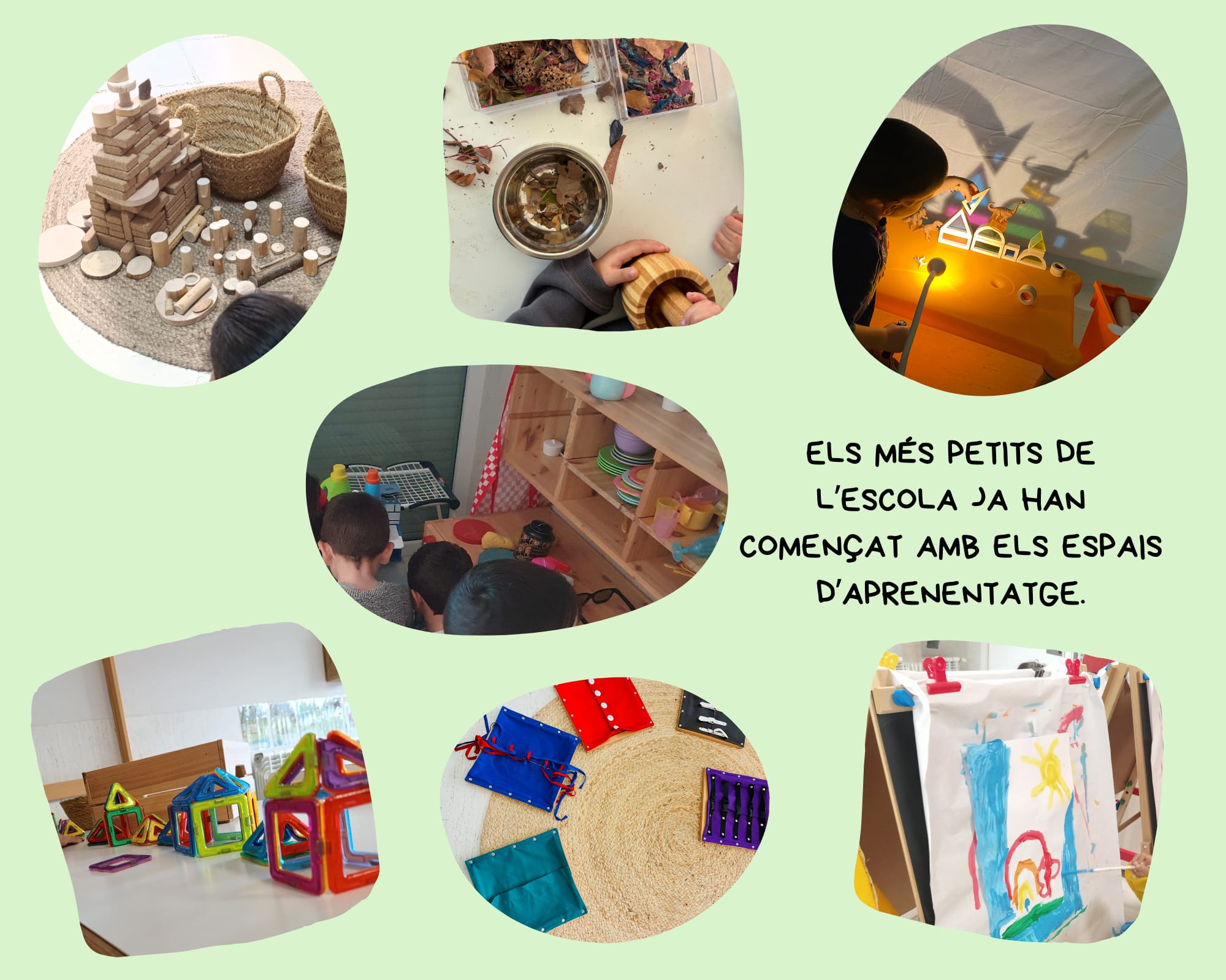 Cada espai està ambientat amb una temàtica que ofereix diverses propostes obertes i lliures. Els espais són els següents: “Laboratori del món”, “Natura”, “Llum i color”, “Mirades”, “1-2-3 acció”, “En construcció” i ” Joc de viure/free play”. Els infants esperen amb molta il·lusió els dies dels espais. Arriben amb moltes ganes de fer i s’engresquen ràpidament; cadascú pot escollir i descobrir entre moltes i variades propostes. A més a més, poden compartir aquest moment amb els seus amics i amigues d’altres classes. L’aprenentatge és a partir del seu interès i de les seves necessitats.