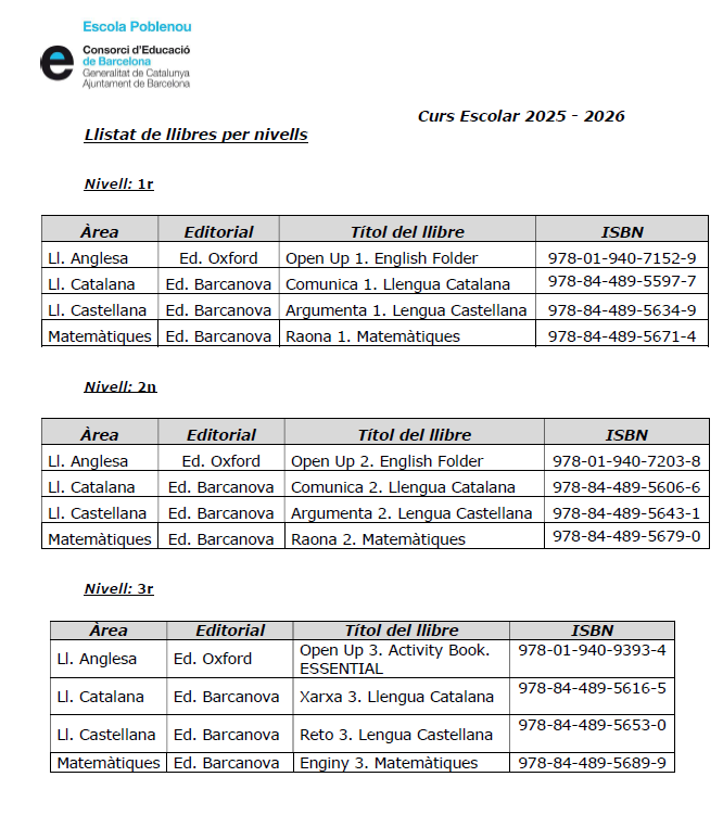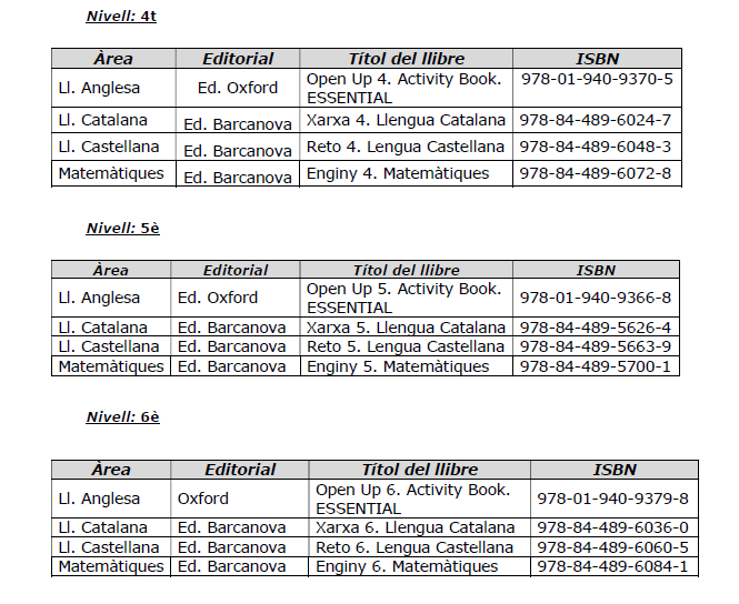 Llibres de text Curs 2025-2026 Preu anual per material i sortides: Educació Infantil: 210€ Primària: 150€