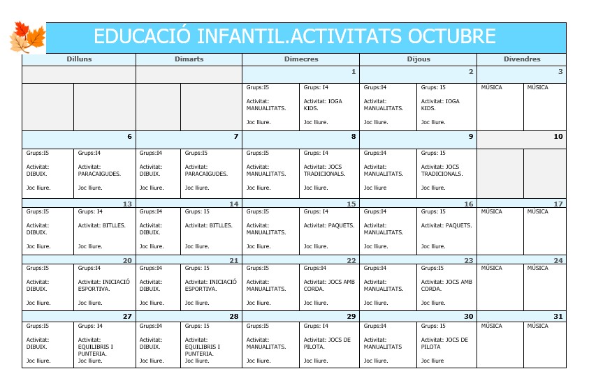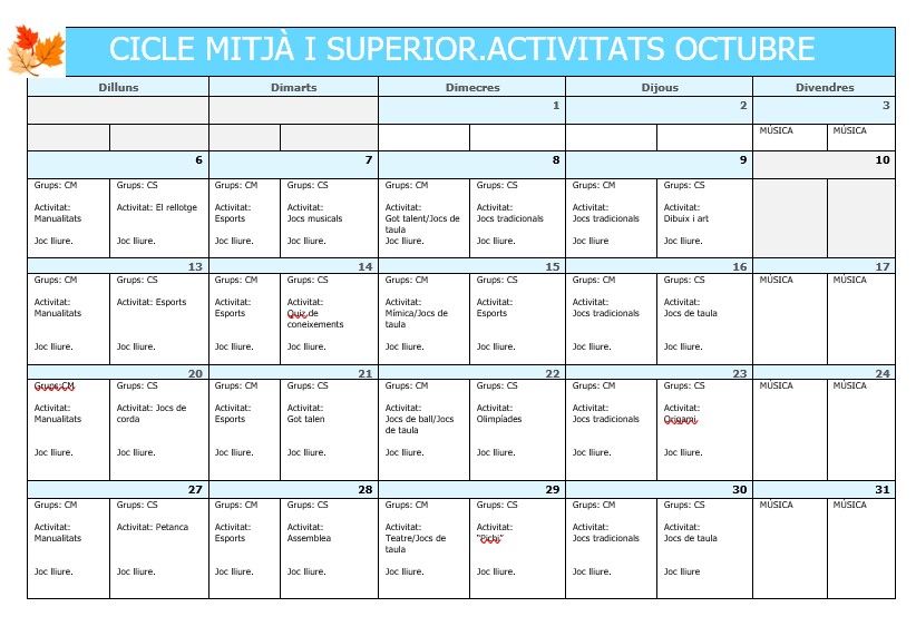 Programació d’activitats espai migdia. Curs 25-26 Feu un comentari / Per Menjador Escola Poblenou / 7 de setembre de 2025 / Menjador Benvolgudes famílies aquí podeu veure les activitats que es realitzen a l’espai migdia.