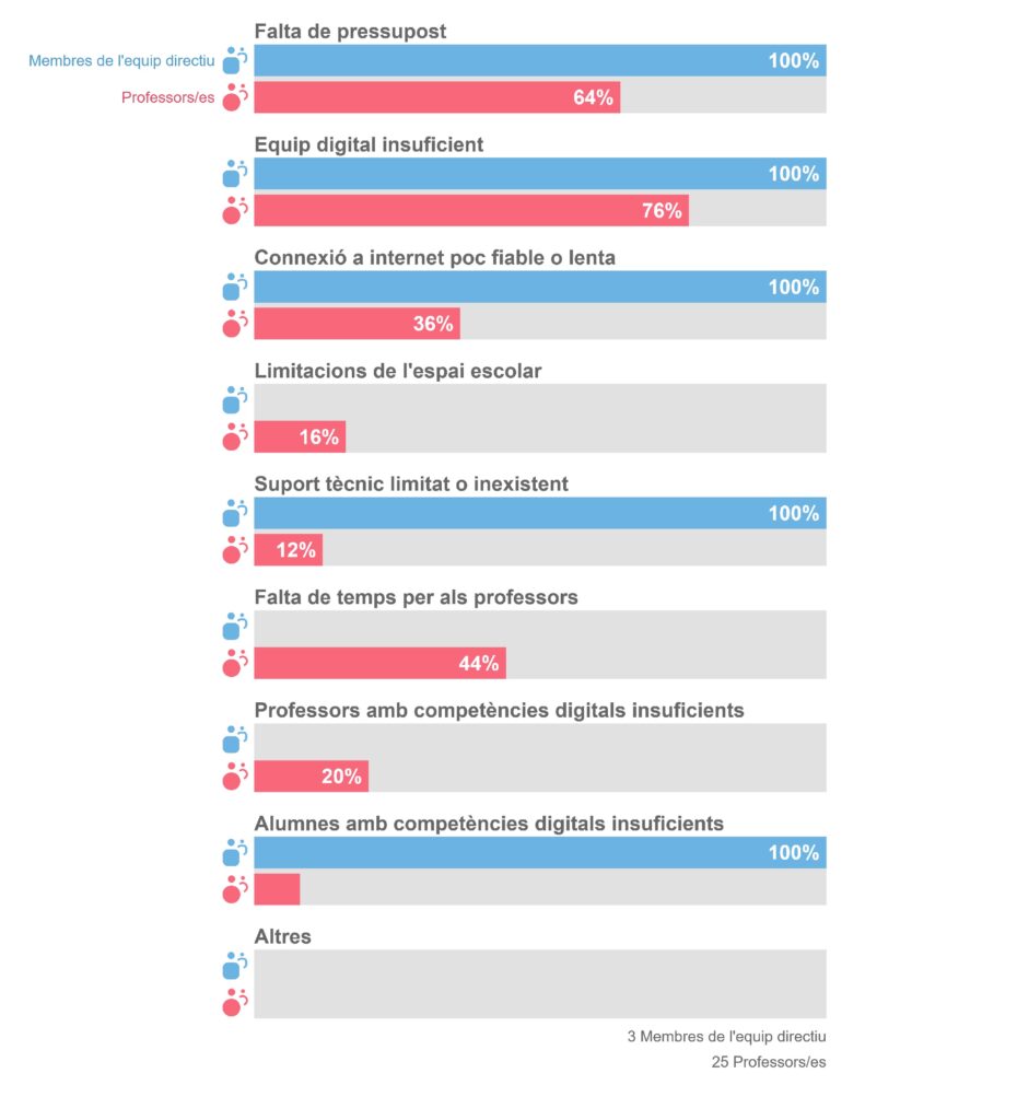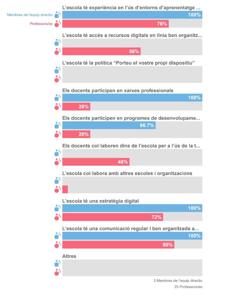 Hi ha discrepàncies entre la visió de l’equip directiu i la del professorat, sent aquest segon el que puntua més baix a les tres preguntes. Han quedat en prioritat mitjana els aspectes B2 (debat sobre l’ús de la tecnologia) i B3 (col·laboracions), i en prioritat alta el B1 (avaluació del progrés).