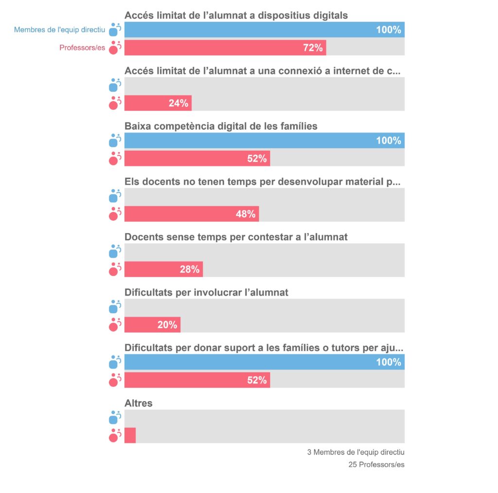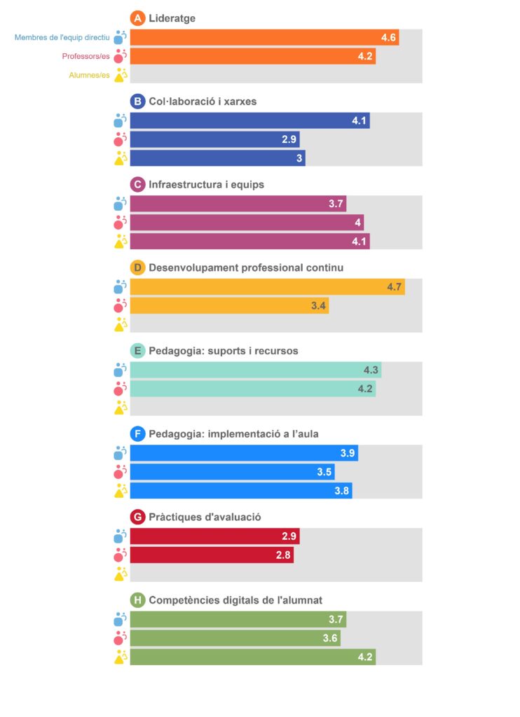 B2: Debat sobre l’ús de la tecnologia. Prioritat mitjana B3: Col·laboracions (prioritat mitjana per part del professorat) C5: Assistència Tècnica. Prioritat mitjana. C7: Protecció de dades. . Prioritat mitjana. D3: Intercanvi d’experiències. Prioritat mitjana E2: Creació de recursos digitals. Prioritat mitjana. F1: Adaptació a les necessitats de l’alumnat. Prioritat mitjana. F3: Foment de la creativitat. Prioritat mitjana. F5. Col·laboració de l’alumnat. Prioritat mitjana. F6: Projectes interdisciplinaris. . Prioritat mitjana. G1: Avaluació de les capacitats. . Prioritat mitjana. G3: Retroalimentació adequada. Prioritat alta. G5: Autoreflexió sobre l’aprenentatge. Prioritat alta. G7: Comentaris a d’altres alumnes sobre la seva feina. Prioritat alta. H5: verificar la qualitat de la informació. Prioritat mitjana. H7: Atorgar reconeixement a la feina dels altres. Prioritat mitjana. H9: creació de continguts digitals. Prioritat mitjana. Diferència elevada entre diferents grups que han respost l’eina. |