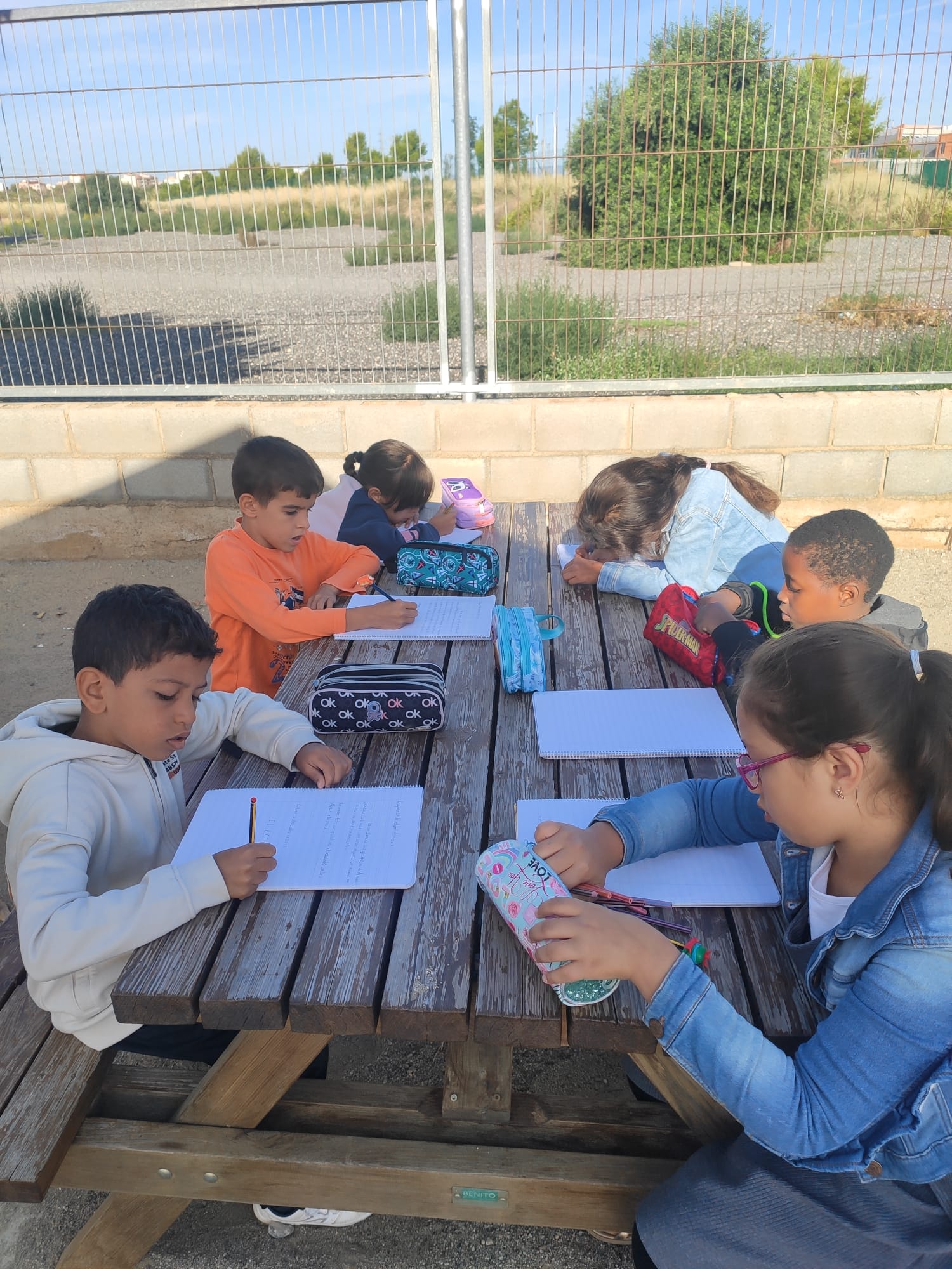 Els nens i nenes de 4t, aprofitant les temperatures d’aquests dies, hem sortit a fer el treball d’expressió escrita a les taules que tenim al pati. Hem gaudit d’una sessió diferent, del solet i de la tranquil·litat… De ben segur que si el temps ens deixa repetirem…