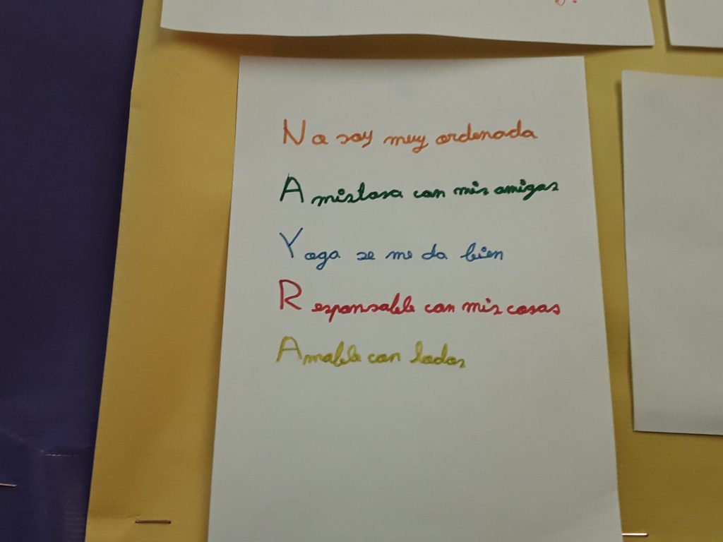 Los/as alumnos/as de 5º, en castellano, hemos hecho unos acrósticos con nuestros nombres. Lo hemos hecho en forma de poema para explicar cosas sobre nosotros. Nos ha parecido muy bien hacer acrósticos porque nos parece una manera interesante de conocernos. EJEMPLO: PAZ ORIGINAL NIÑOS ESTUDIAR NIÑAS TRABAJADORES/AS