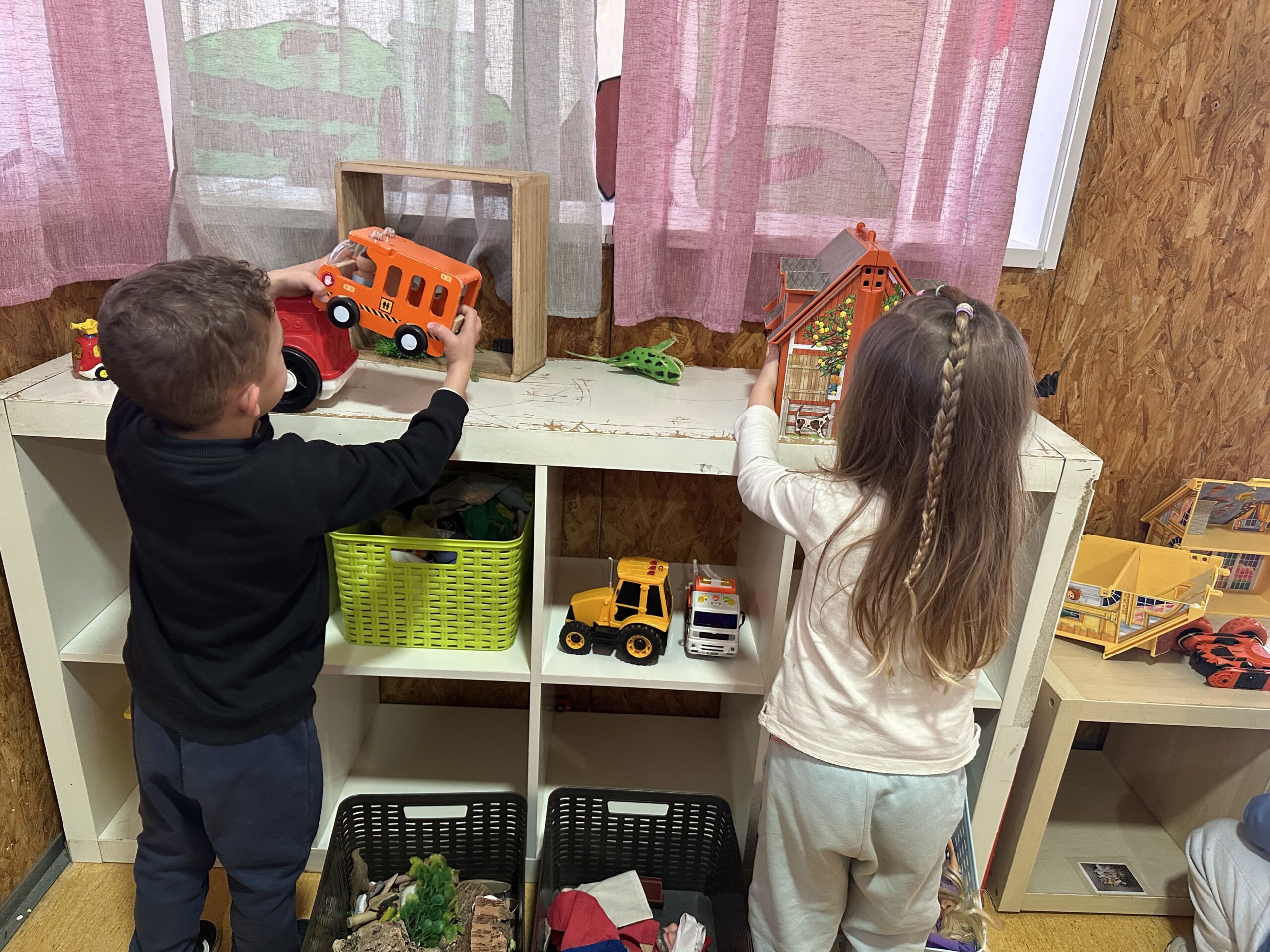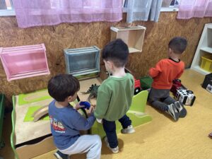 A partir de diferents materials i propostes, creen petites històries de manera individual o compartida, tot gaudint del procés creatiu. L’ambient afavoreix la conversa, l’intercanvi d’idees i la cooperació, així com el respecte pel joc dels altres i l’escolta atenta de les explicacions dels companys i companyes, en un clima tranquil i acollidor.