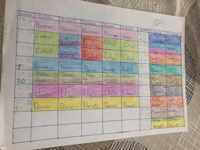 Cada persona ha pintat cada cosa de diferents color com per exemple: els deures ho pintem de color blau clar, llegir de color vermell, el futbol (si teniu extraescolar) verd, la dutxa de color taronja i així cada apartat d’un color, no es pot repetir el color.