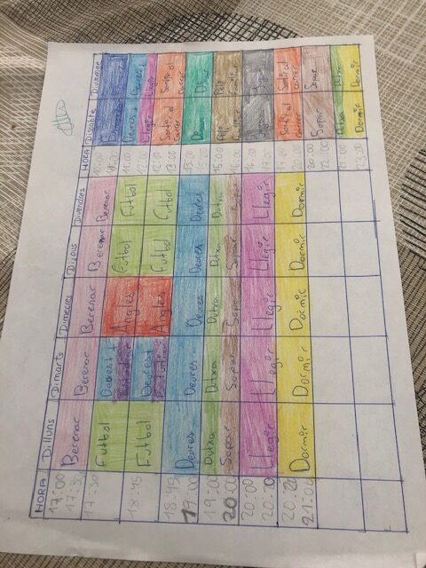 Cada persona ha pintat cada cosa de diferents color com per exemple: els deures ho pintem de color blau clar, llegir de color vermell, el futbol (si teniu extraescolar) verd, la dutxa de color taronja i així cada apartat d’un color, no es pot repetir el color.