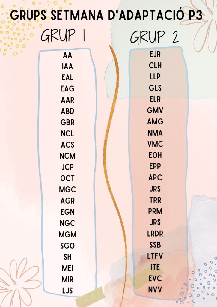 Aquí teniu l‘horari d’adaptació dels primers dies de setembre i el grup al qual pertany el vostre fill o filla. Recordeu que només hi consten les seves inicials (nom i cognoms).