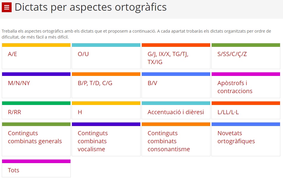 En aquest enllaç trobaràs un munt de dictats de la gencat per practicar online. Estan classificats per aspectes ortogràfics i a cada apartat trobaràs els dictats organitzats per ordre de dificultat, de més fàcil a més difícil.