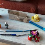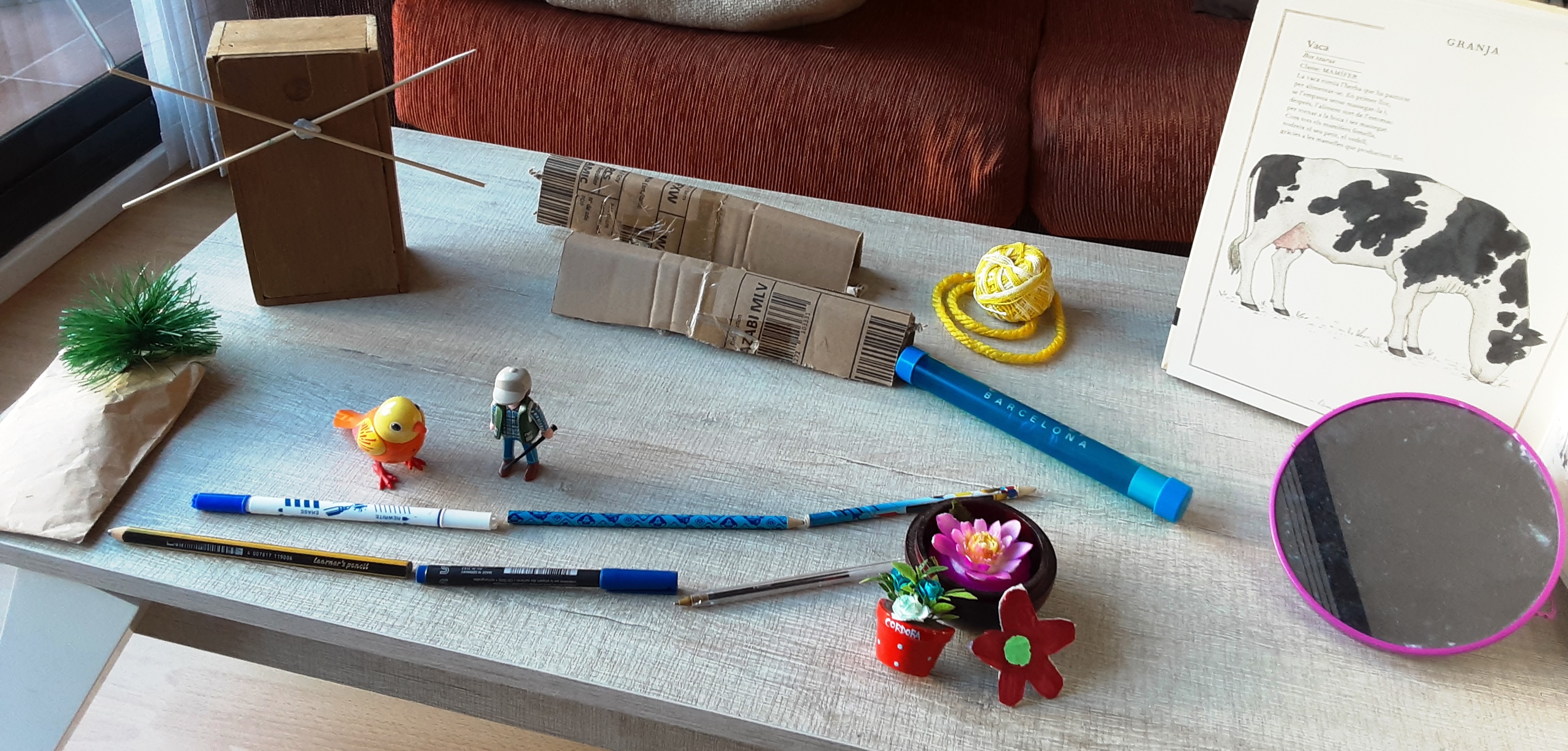 Mirad que he hecho en mi casa con materiales diversos que he ido encontrando por ahí: bolígrafos, imanes de la nevera, un espejo, un libro, cartones de un paquete, un ovillo de hilo, una caja de piezas de ajedrez, unos palillos….