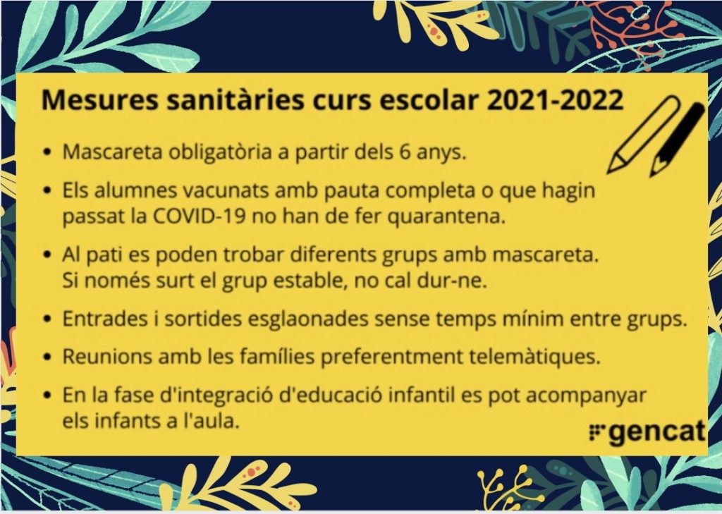 Aquí podeu trobar un petit resum de les mesures sanitàries pel curs 2021-2022 que recomana la Generalitat.