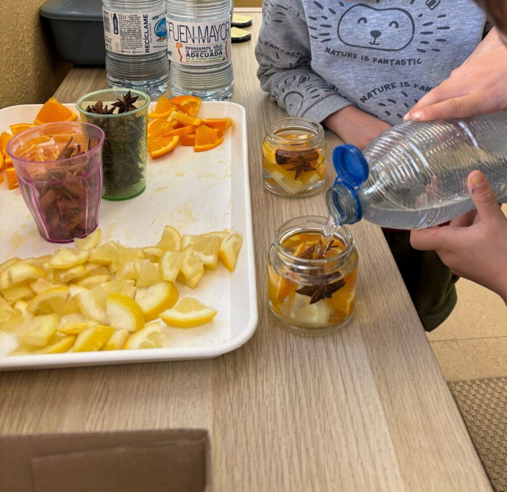 Durant els dies previs, els infants van preparar amb molta il·lusió uns pots d’olor plens d’essències naturals. Amb anís estrellat, taronja, llimona, canyella, alcohol i aigua, vam crear petits tresors aromàtics que ens van ajudar a despertar els sentits i a descobrir les propietats de les plantes remeieres.