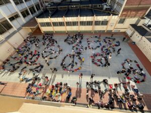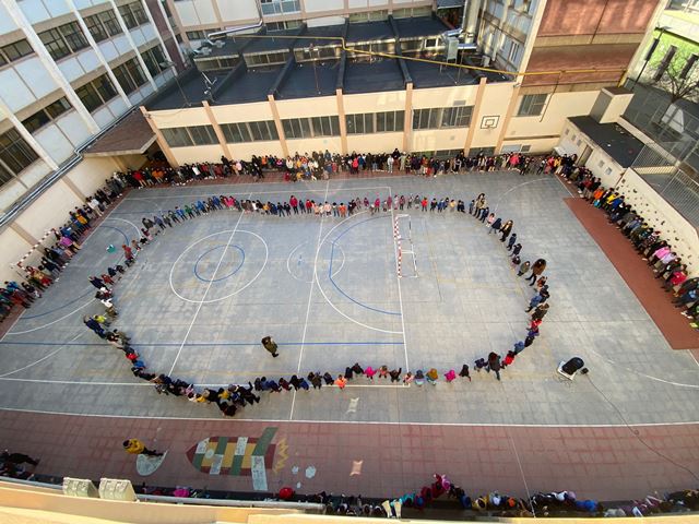 Tots el nens i nenes hem cantat la cançó  “Una veu feta de mil veus” al pati de l’escola. Després de l’esbarjo, ens hem col·locat per grups de colors (cada grup està format per alumnat de totes les edats) i hem fet   diferents activitats: el crit de grup, ordenar-nos de petits a grans per fer-nos una abraçada i dir-nos missatges bonics i finalment cada grup ha fet els símbol de la Pau al terra amb el cos.