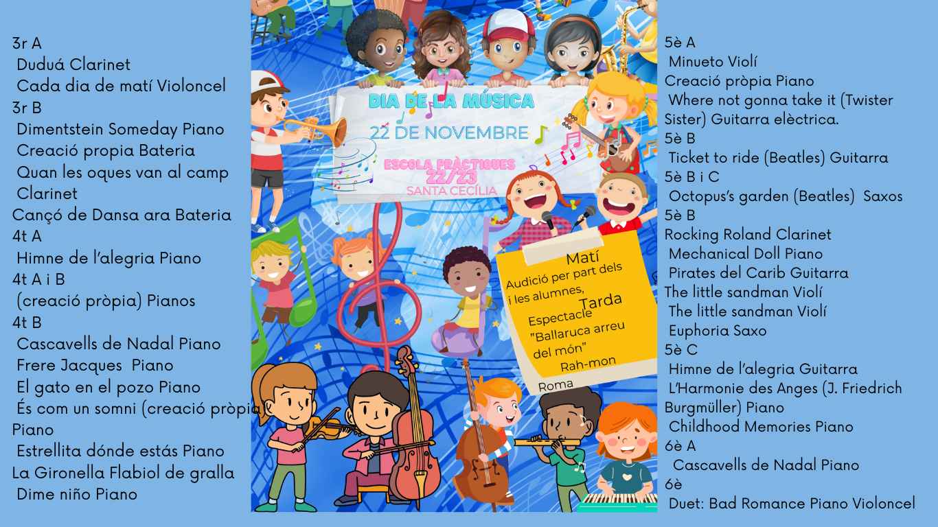 22 de novembre “Dia de la música”. Felicitem i donem les gràcies als nens i nenes músics de l’escola, que repartirts en quatre espais en han fet gaudir del seu talent musical . Després del descans en grups de colors tota l’escola ha fet una activitat juntant nens de tots les edats i a la tarda concert amb el grup Rah- Mon Roma. Hem ballat, cantat i en ho hem passat molt bé tots junt al pati. Ja teniu penjades les fotos i els vídeos.