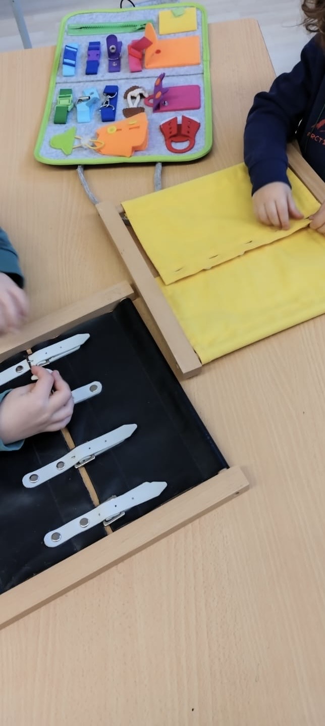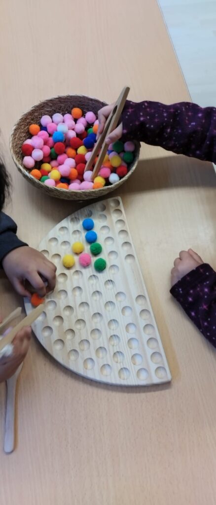 Mans manetes: En aquest espai treballem la motricitat fina a través de diferents propostes manipulatives com ara classificació amb pinces, cordar botons, enfilar…
