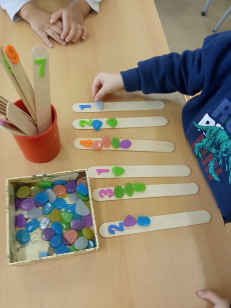 Lògica i matemàtiques: Treballem conceptes matemàtics i lògics senzills de manera dinàmica i manipulativa, estimulant la discriminació visual, les característiques de diferents objectes i materials, les mesures i longituds, la geometria…