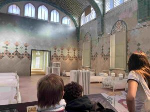 Després de dinar en un parc per agafar forces, vam continuar la sortida a l’Hospital de Sant Pau. Ens va sorprendre molt descobrir que el recinte està format per nombrosos pavellons, cadascun amb el seu nom i dedicat a una especialitat mèdica diferent, tots connectats per passadissos subterranis.