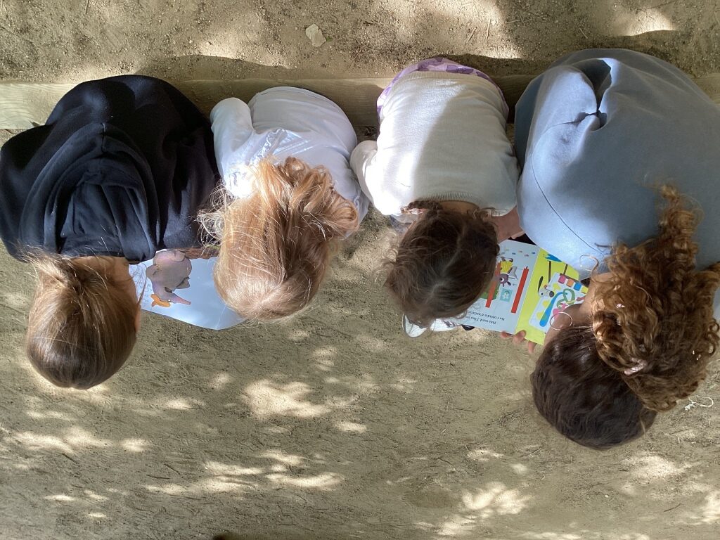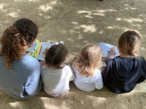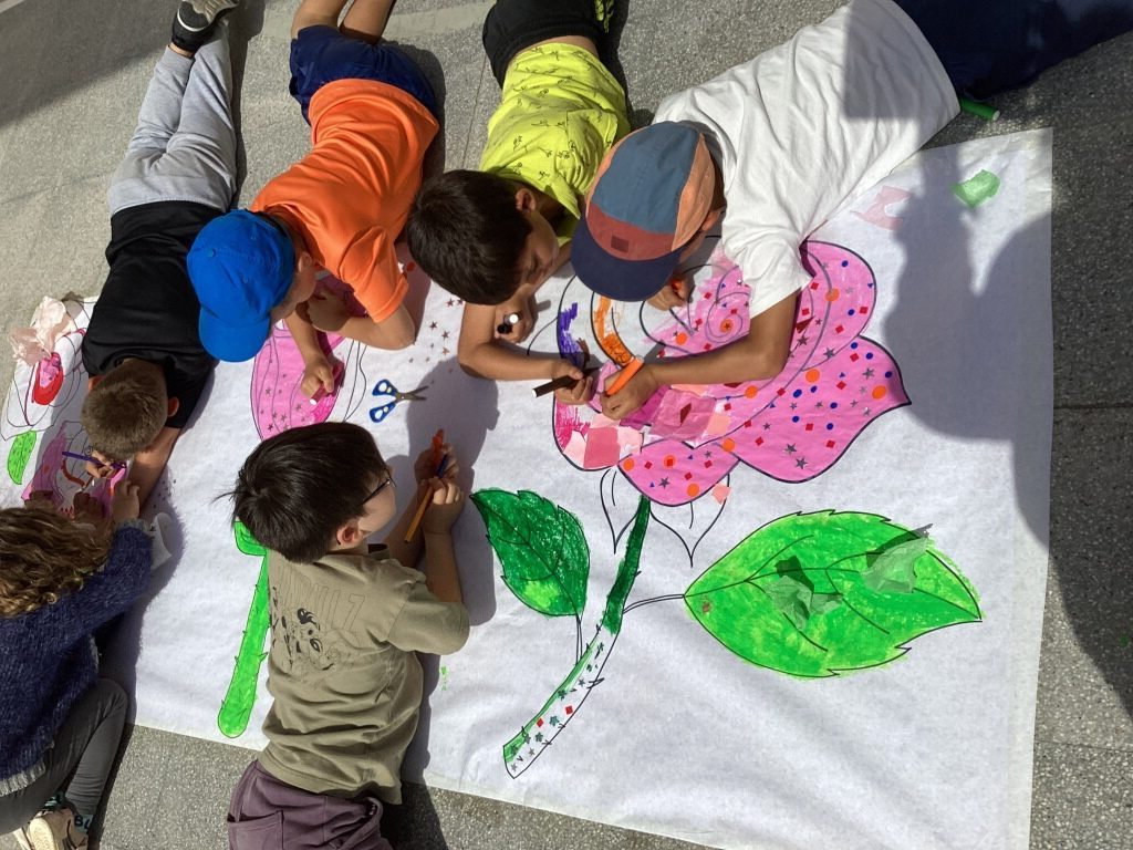 A la tarda de primer a tercer vam fer tallers artístics al pati i l’alumnat de quart a sisè van agafar els seus fillols i les seves filloles i van compartir la lectura i explicació de contes al jardí de escola.