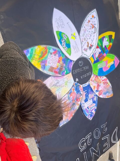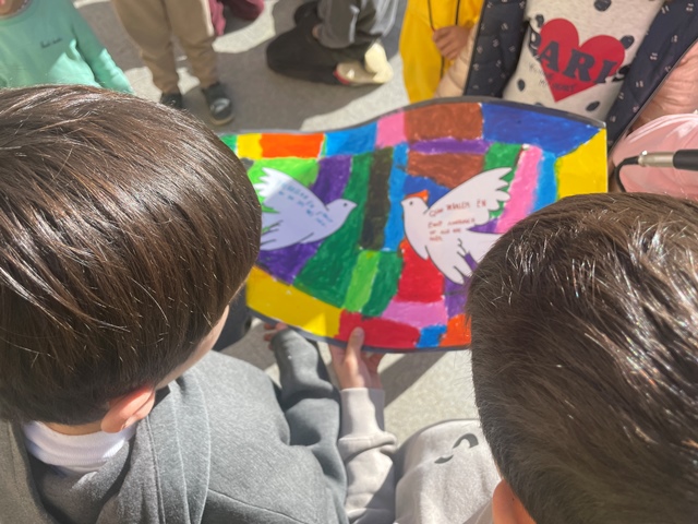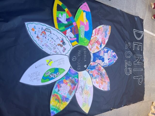 Al matí,  vam fer una gran flor humana al pati amb tota la comunitat educativa i vam cantar dues cançons per la Pau. A continuació, els i les  representants de cada aula van llegir el seu missatge interpretat en una gran fulla. Tots els pètals van crear la flor de la Pau. Grans i petits vam gaudir molt d’aquest dia.