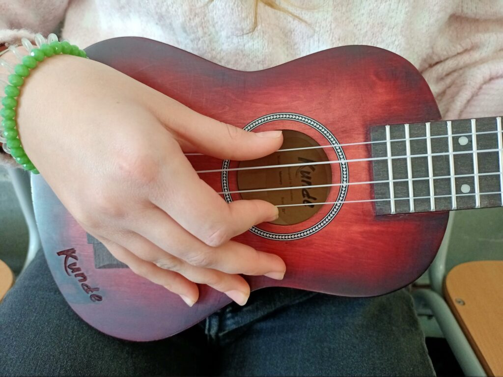 Al cicle de grans, hem començat amb el nostre projecte d’ukelele. L’Ukelele permet vivenciar conceptes de llenguatge musical, d’història de la música o d’harmonia, a banda d’anar adquirint les tècniques bàsiques de l’instrument de manera molt graduada i pensada didàcticament. Possibilita aprendre a viure la música en grup, a sentir-se part d’un conjunt.
