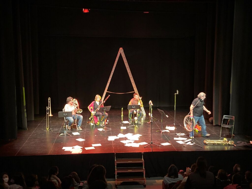 Els infants de 3r van anar al teatre Margarida Xirgú per veure l’espectacle “Bufa’l tu”, organitzat pel Conservatori de Música de Badalona. Allà, van poder gaudir de diverses interpretacions d’instruments clàssics de vent i… de no tan clàssics: una escala, una cadira, una tanca de carrer… A més, hi va haver un moment participatiu a