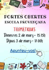 Les jornades de portes obertes es realitzaran aquest curs de forma telemàtica degut a la situació actual en què ens trobem. La nostra escola realitzarà dues sessions: