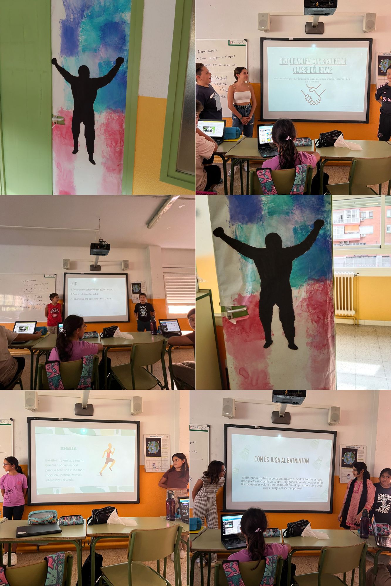 Per decorar la porta de la classe, hem pintat la silueta del famós boxejador Rocky Balboa i l’hem estampat en un fons blau, vermell i blanc.