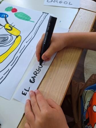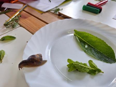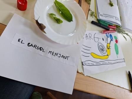 També hem trobat 1,2,3… fins a 7 cargols! Hem agafat el més gran per dibuixar-lo a classe. L’hem posat sobre una fulla i al cap d’una estona hem vist un forat. El LF ha dit “¡Comer!” “Look, look, comer!” I s’ha posat a dibuixar per explicar-ho. Hi ha persones que tenen dificultats per expressar-se amb la parla, però poden fer-ho per altres vies. El LF en ho ha dibuixat.