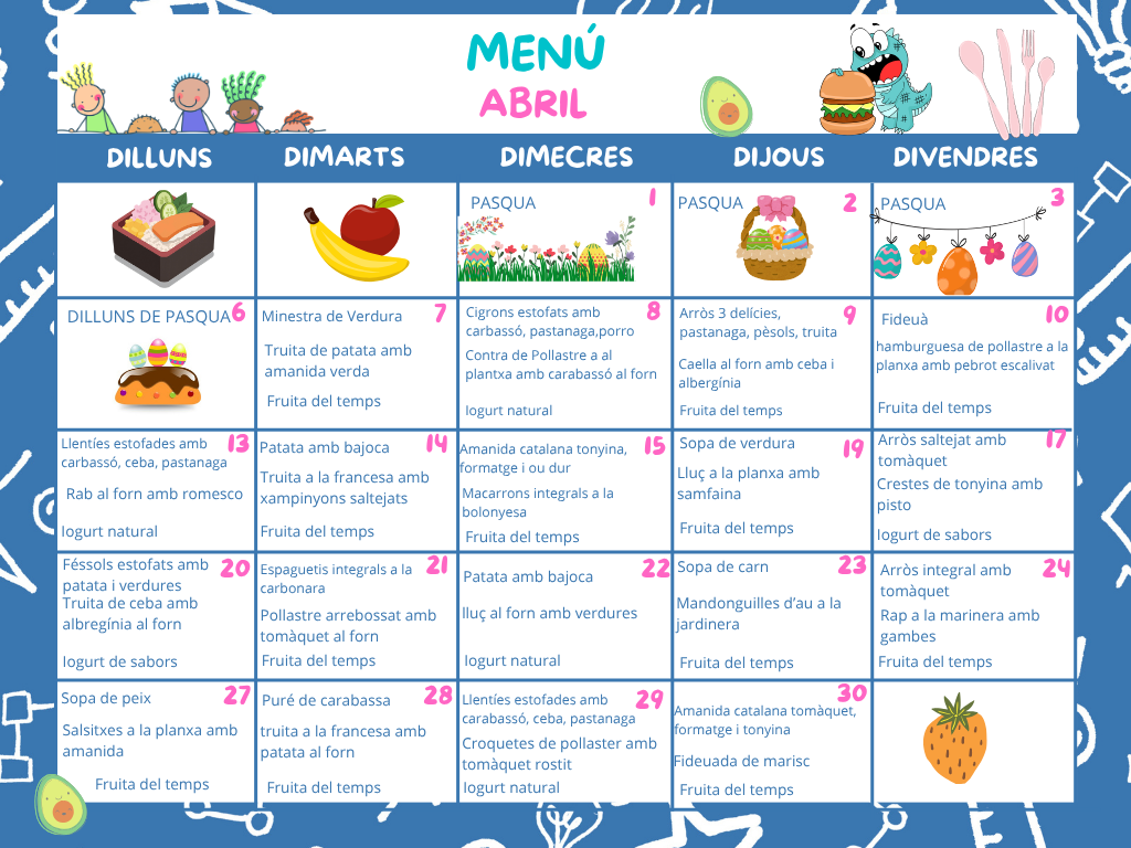 PAGAMENT: Alumnes fixos, rebut bancari domiciliat del 1 al 5 de cada mes. Si s’ha de faltar al servei, avisar abans de les 9h 30′, es ficarà un abono al rebut del mes següent.