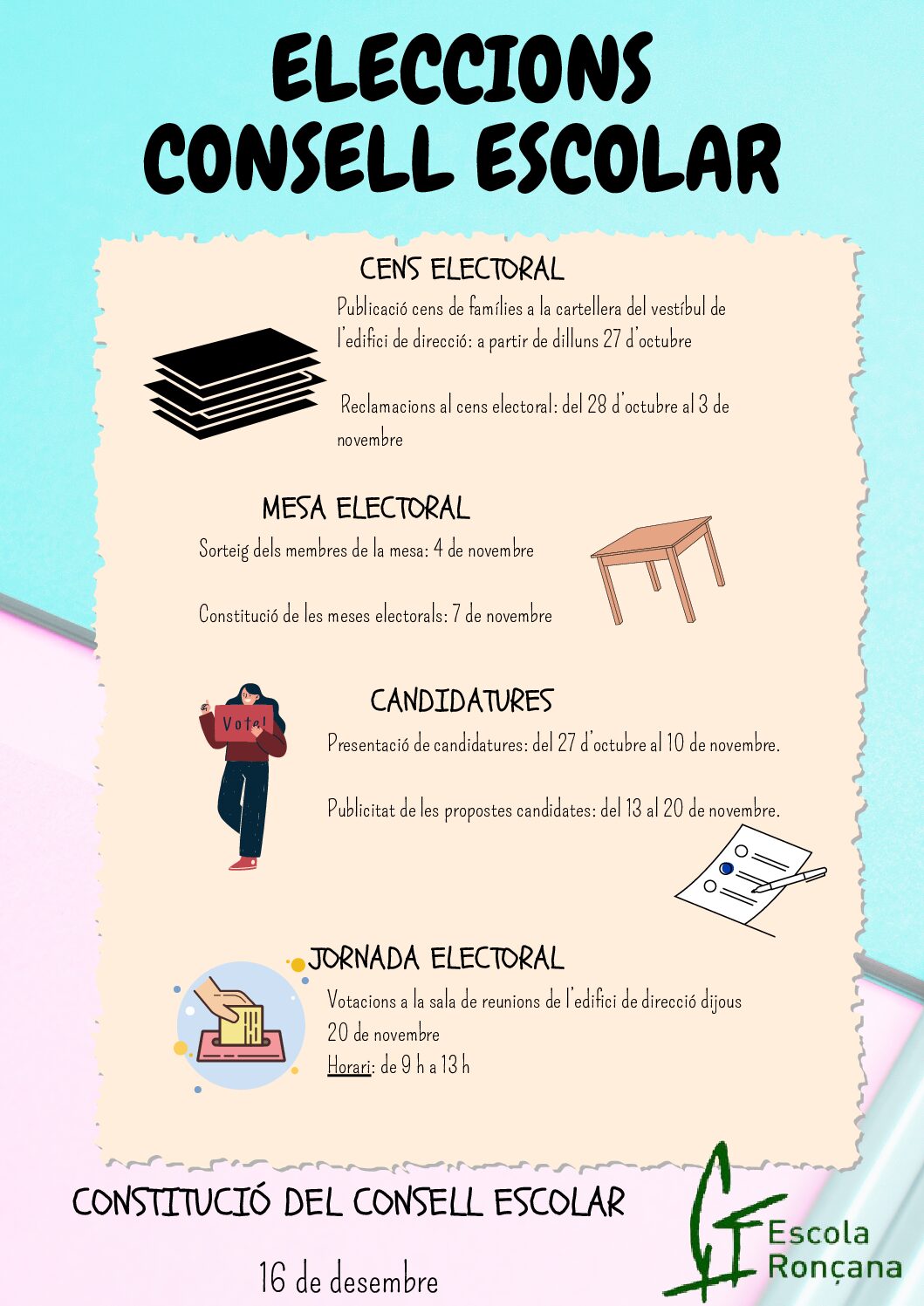 El pròxim 20 de novembre hi haurà votacions al consell escolar a l’edifici de direcció de 9 a 13 hores. Veniu a votar!!